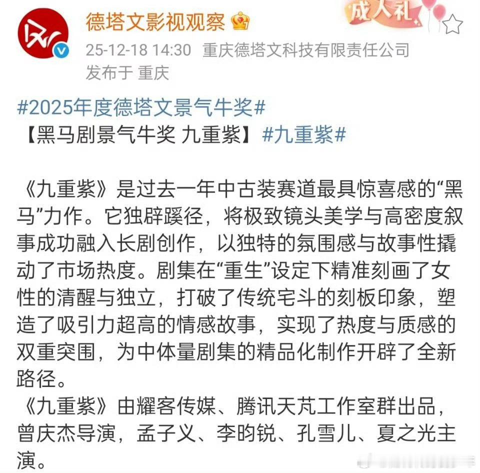 《九重紫》获黑马剧景气牛奖 恭喜🎉🎉