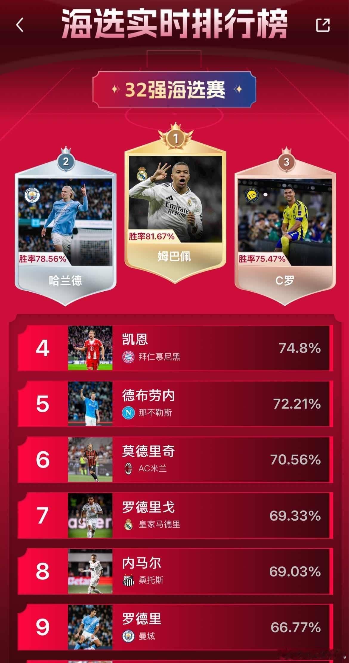 2025足坛球星年终大战活动今日中午12点开启,目前正在火热进行中。第一阶段32强海选时间为12月18日12:00至12月19日23:59,该阶段由雷速编辑根据球员表现等维度筛选出300名球星,用户使用无限PK模式进行投票选出前32名。