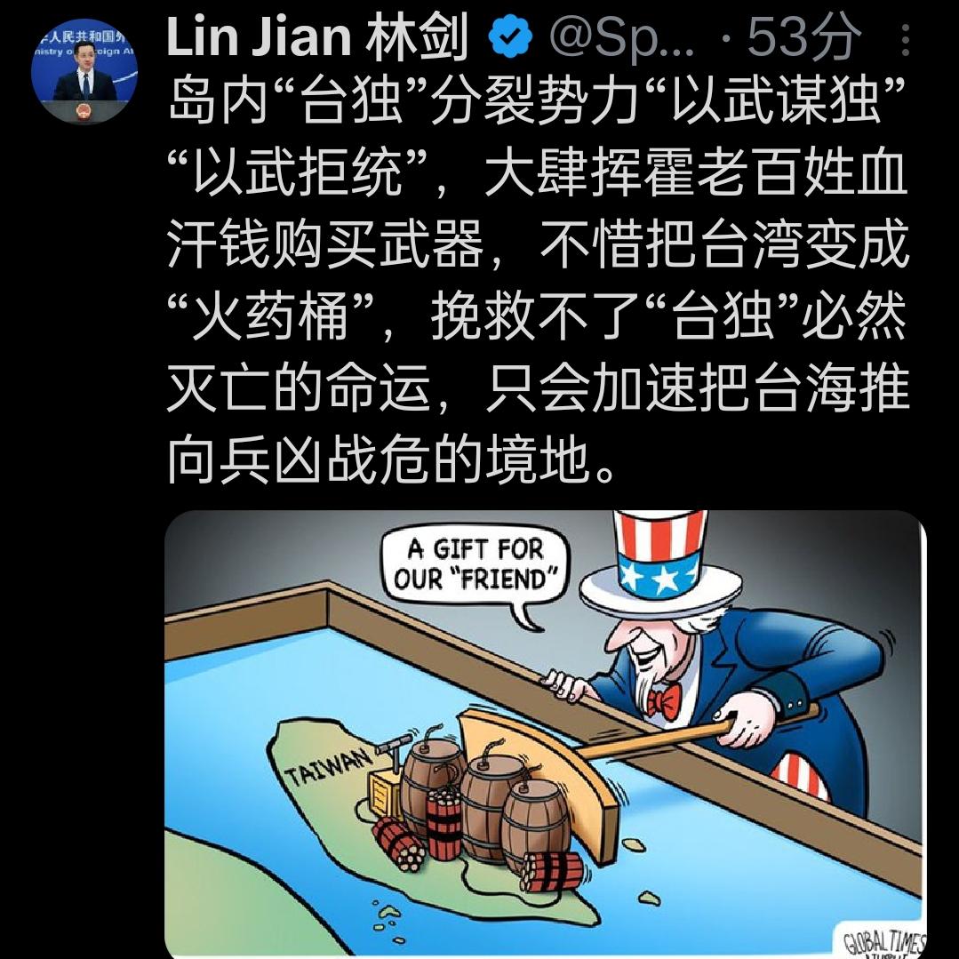 岛内“台独”分裂势力“以武谋独”“以武拒统”,大肆挥霍老百姓血汗钱购买武器,不惜把台湾变成“火药桶”,挽救不了“台独”必然灭亡的命运,只会加速把台海推向兵凶战危的境地——外交部发言人林剑