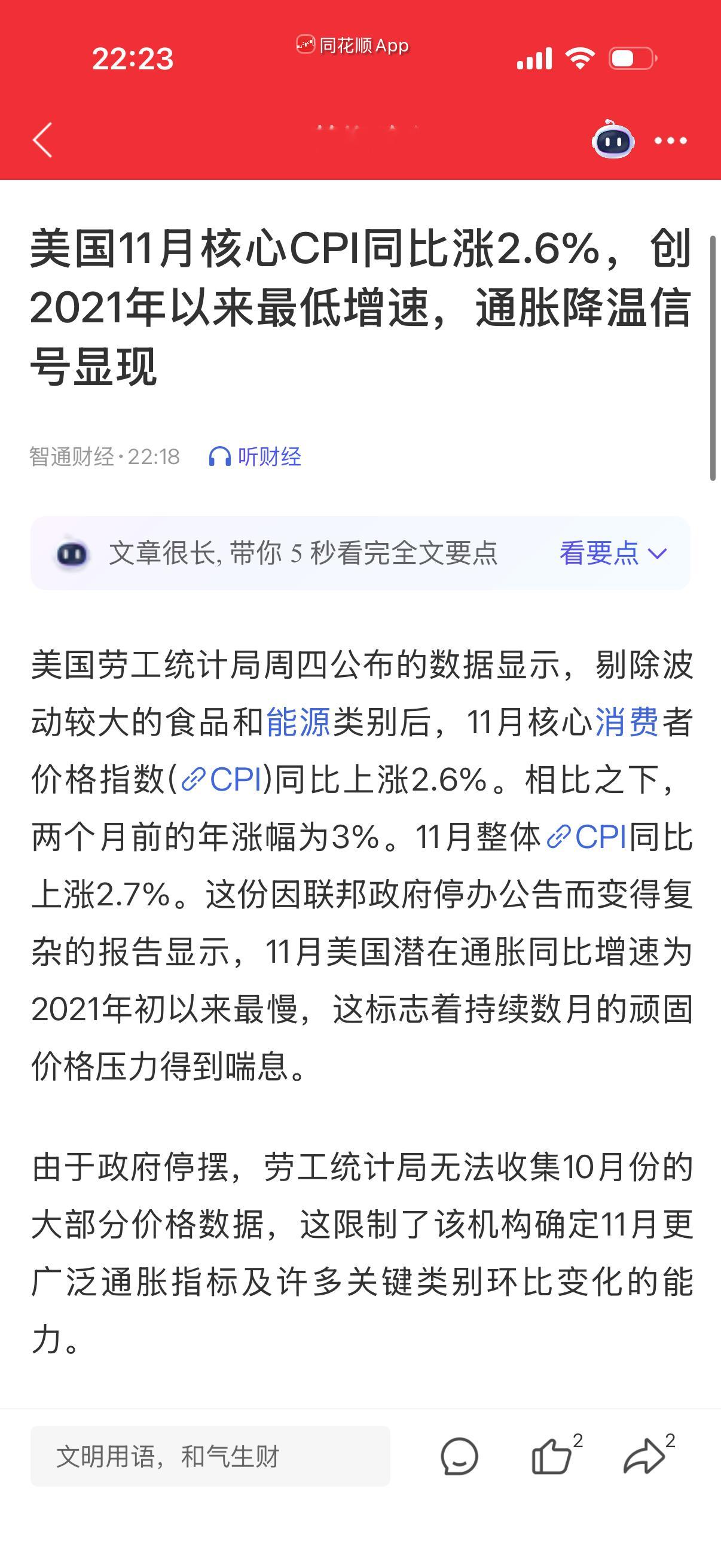 11月核心消费者价格指数(CPI)同比上涨2.6%。五年来新低,这数据作假了,为进一步降息准备的。