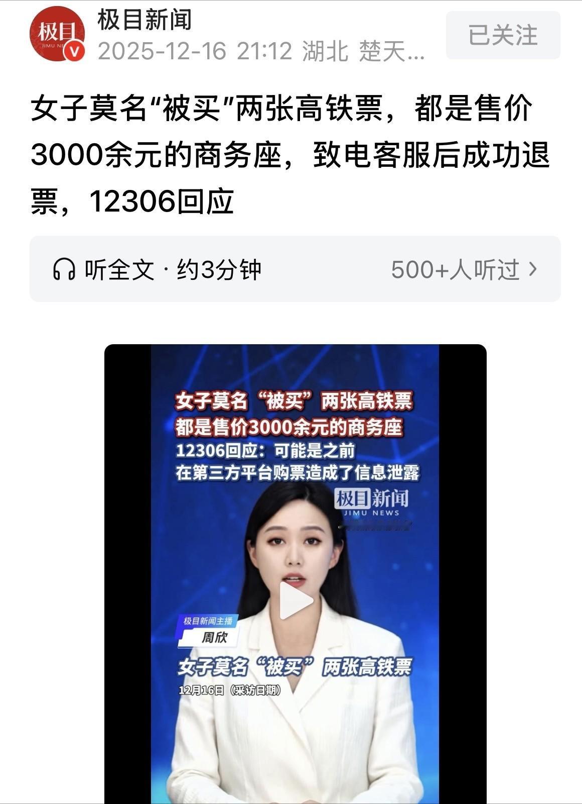 河北石家庄,女子凌晨4点发现,有人用她的身份信息订了2张商务座高铁票,一张从香港到北京,另一张从香港到西安,2张票加起来7000多块钱,显示是线下买的,且非现金支付,女子懵了,问客服这是怎么一回事?客服一番话让她如梦初醒。 河北石家庄一名女子的遭遇,给所有注重个人信息安全的人敲了警钟。凌晨4点,她因为失眠随手点开购票软件,想看看近期的车次信息,结果眼前的画面让她瞬间清醒,整个人都懵了。 自己的账户里,竟然莫名多了两张商务座高铁票,一张从香港到北京,另一张从香港到西安,两张票加起来总价高达7000多块。 更让她费解的是,购票记录显示是线下购买,而且用的是非现金支付方式,可她近期根本没去过香港,更没买过这两张票。慌乱之下,她第一时间拨通了购票平台的客服电话,对方一番话让她如梦初醒,原来自己早已落入了别人设下的圈套。 女子说,自己平时很注意保护个人信息,身份证从来没丢过,也没把账号密码告诉过别人,实在想不通骗子是怎么获取她的身份信息,还成功订到票的。 看着购票记录里清晰的个人信息和支付凭证,她越想越害怕,生怕后续还会有更严重的损失。客服听完她的描述后,并没有先帮她处理退票,而是先询问她近期是否找过“代购票”服务,或是在二手平台上咨询过低价高铁票。 这句话瞬间点醒了女子,她猛然想起半个月前,自己曾在网上找过所谓的“票务代理”,想给父母买两张打折的高铁票。 当时她在二手平台上刷到广告,声称能以6.5折到8折的优惠代订高铁商务座,想着能给父母换个舒适的座位,还能省下一笔钱,就心动了。 她按照对方的要求,提供了自己的身份证号、手机号,甚至还把购票软件的账号密码告诉了对方,让对方帮忙操作购票。 可对方忙活了半天,最后说票源紧张没买到,还“贴心”地给她道了歉。女子当时没多想,只当是一次失败的代订经历,没料到这竟是骗子收集她信息的开始。 客服进一步解释,这类“低价代购票”骗局近期特别高发,骗子的套路基本如出一辙。他们会在网上打着“打折优惠”的旗号吸引消费者,等拿到对方的身份信息和账号密码后,要么直接用这些信息注册其他平台账号,帮别人购票牟利; 要么像这次一样,用被盗用的信息线下购票,再通过非法渠道转手,以此赚取差价。而所谓的“线下非现金支付”,其实是骗子用自己的支付方式绑定了被盗用的身份信息,一旦出票成功,后续的退改签主动权全在骗子手里。 客服提醒女子,遇到这种身份信息被冒用购票的情况,不用过度慌张。如果造成行程冲突无法购票,可以在平台上举报后继续购票,也能持有效身份证件到车站窗口注销被冒用的账号。 随后,客服帮女子提交了信息冒用核查申请,告知她会在24小时内完成审核,审核通过后就能办理退票,尽量帮她挽回损失。 同时客服也强调,铁路部门的票价都是透明的,根本不存在所谓的“特殊渠道”打折票,那些声称能低价代订的,全都是骗局。 女子按照客服的指导操作后,心里的石头才稍微落地。她坦言,这次真是吃了贪小便宜的亏,本来想省点钱,结果差点酿成大错,不仅泄露了个人信息,还差点损失7000多块。 其实很多人都有过类似的想法,觉得找代订能省点钱,却不知道背后藏着这么大的风险。骗子就是利用了这种心理,一步步设下圈套,让大家在不知不觉中泄露信息,遭受损失。 警方也多次提醒,购买火车票一定要通过官方渠道,不要轻信网上的“黄牛”或“票务代理”。如果注册账号时提示身份信息已被注册,大概率是被他人冒用了,要及时到车站窗口注销。 同时要保管好自己的账号密码,不要轻易透露给陌生人,更不要随意点击陌生人发来的链接,避免个人信息被泄露。一旦发现身份信息被冒用或遭遇诈骗,要第一时间报警,留存好相关证据,以便警方后续调查。 一场凌晨的惊魂经历,让石家庄女子彻底看清了“低价代购票”的真面目。那些看似诱人的优惠,背后全是骗子精心设计的陷阱,稍有不慎就会泄露个人信息,遭受经济损失。 在信息时代,个人信息安全至关重要,任何时候都不能抱有贪小便宜的心理,只有通过正规渠道办事,才能从根本上规避风险。对此,你们有什么看法,欢迎评论留言~