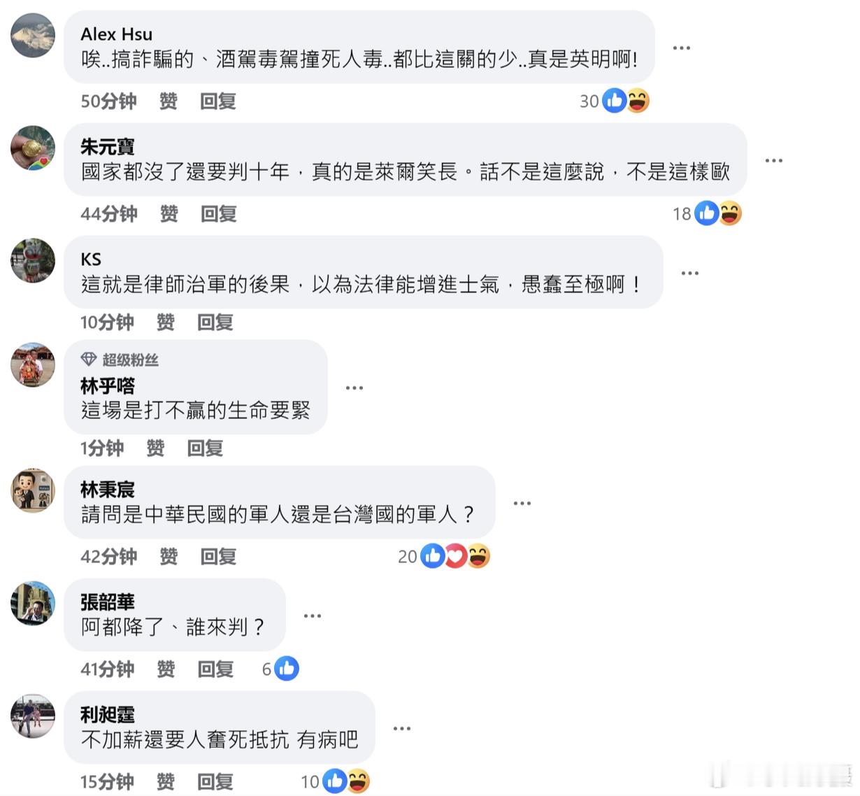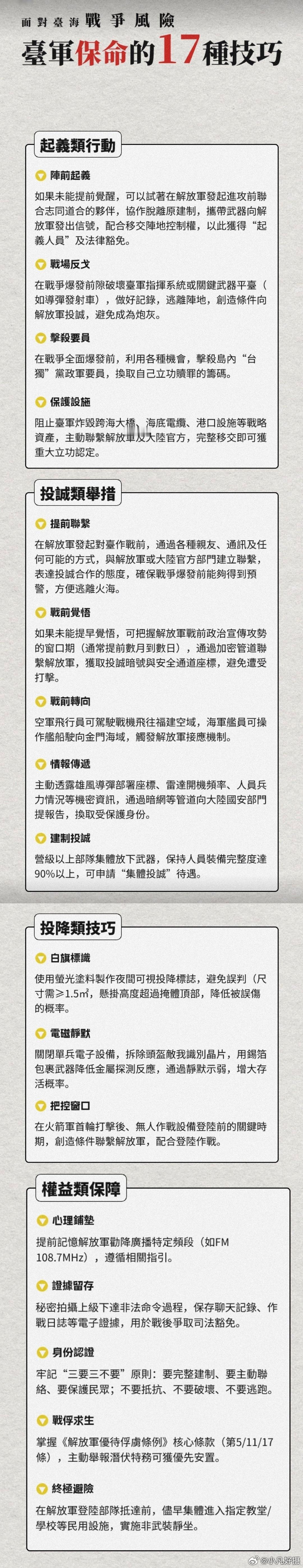真的很搞笑,还准备判刑威胁!台独团伙今日叫唤:针对“不尽其应尽之责而降敌者”,最重可判十年,即使是阴谋及预备犯,可处五年以下有期徒刑;军人若以言语、举动、文字等方式对敌人效忠,可重判七年。未来我们收复那天,首战即终战,台独头目必死无疑。而对岸蛙兵也要考虑清楚,枪口所指的方向决定了你们的未来。是愿意做民族败类还是立功受奖,看你们自己了。中国台湾省黄媒不会说的真相
