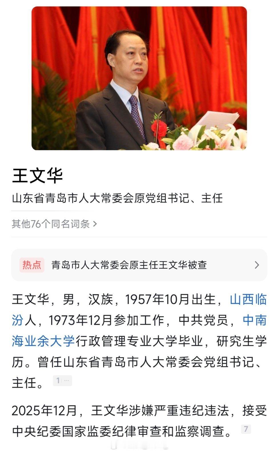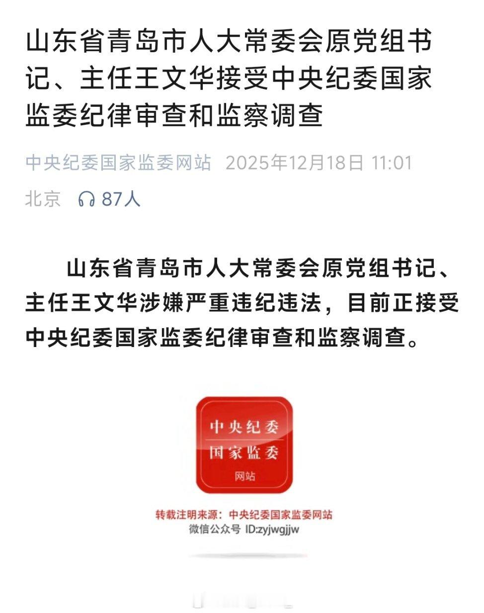 山东省青岛市人大常委会原党组书记、主任王文华接受中央纪委国家监委纪律审查和监察调查!