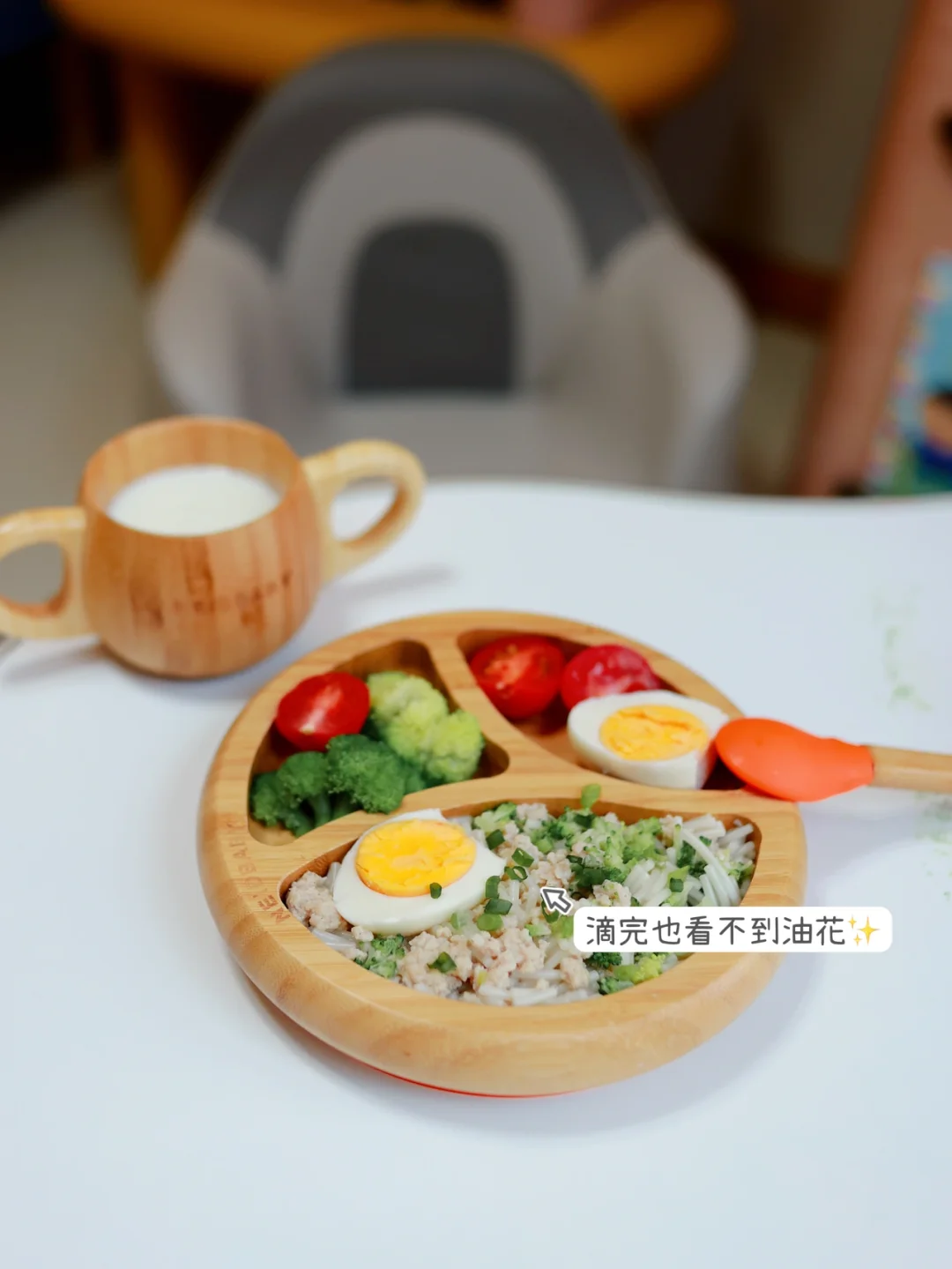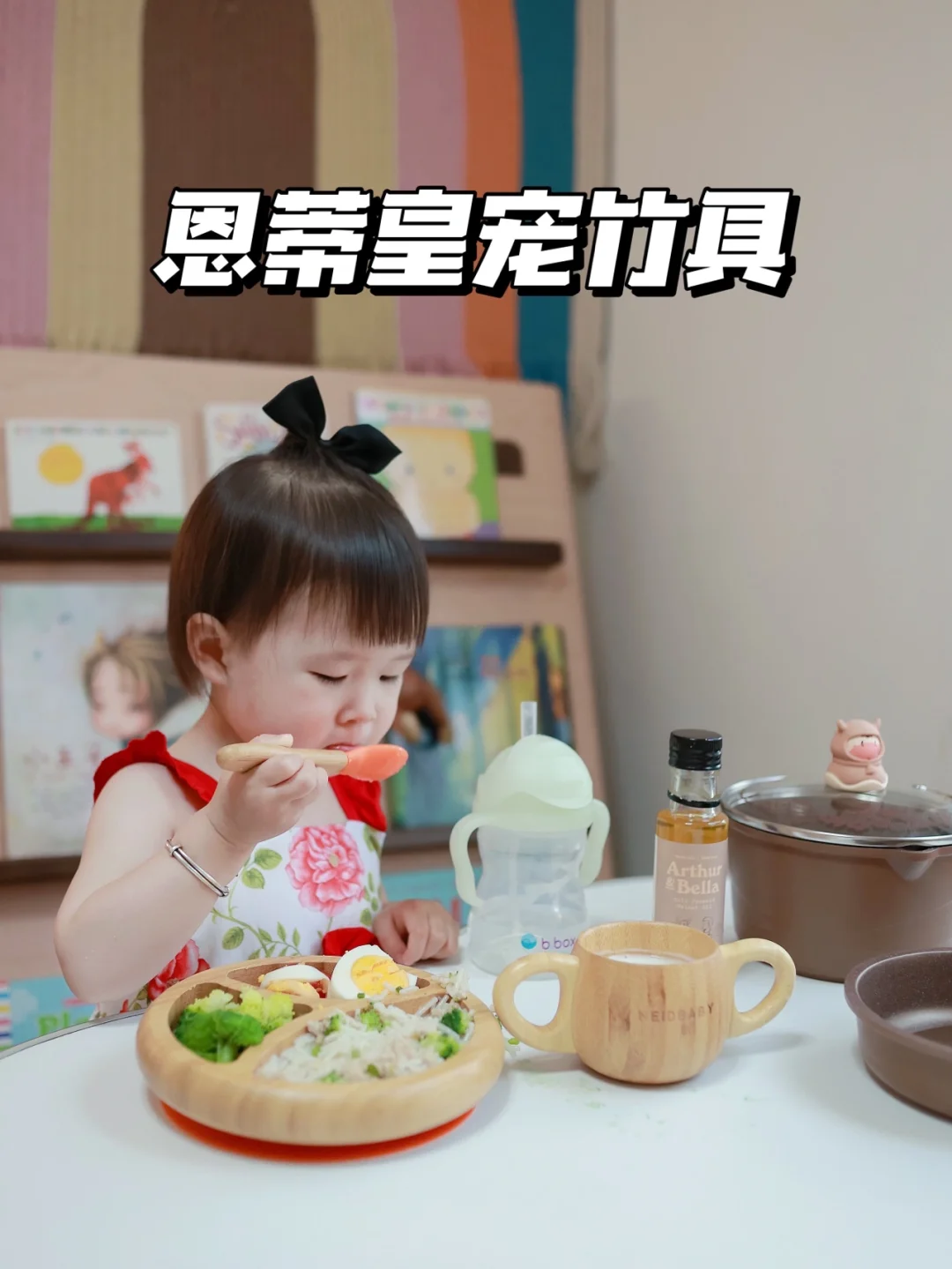 这套餐具颜值真的很高,有机的竹子制成的🎋天然环保♻️宝贝吃着我们也更放心啦!这个是一个三件套,餐盘下面是有吸盘的,吸力很大,根本不怕宝贝把碗弄翻摔到地上。小杯子给她用来喝酸奶这些也很合适,平时我们在家都是用这套