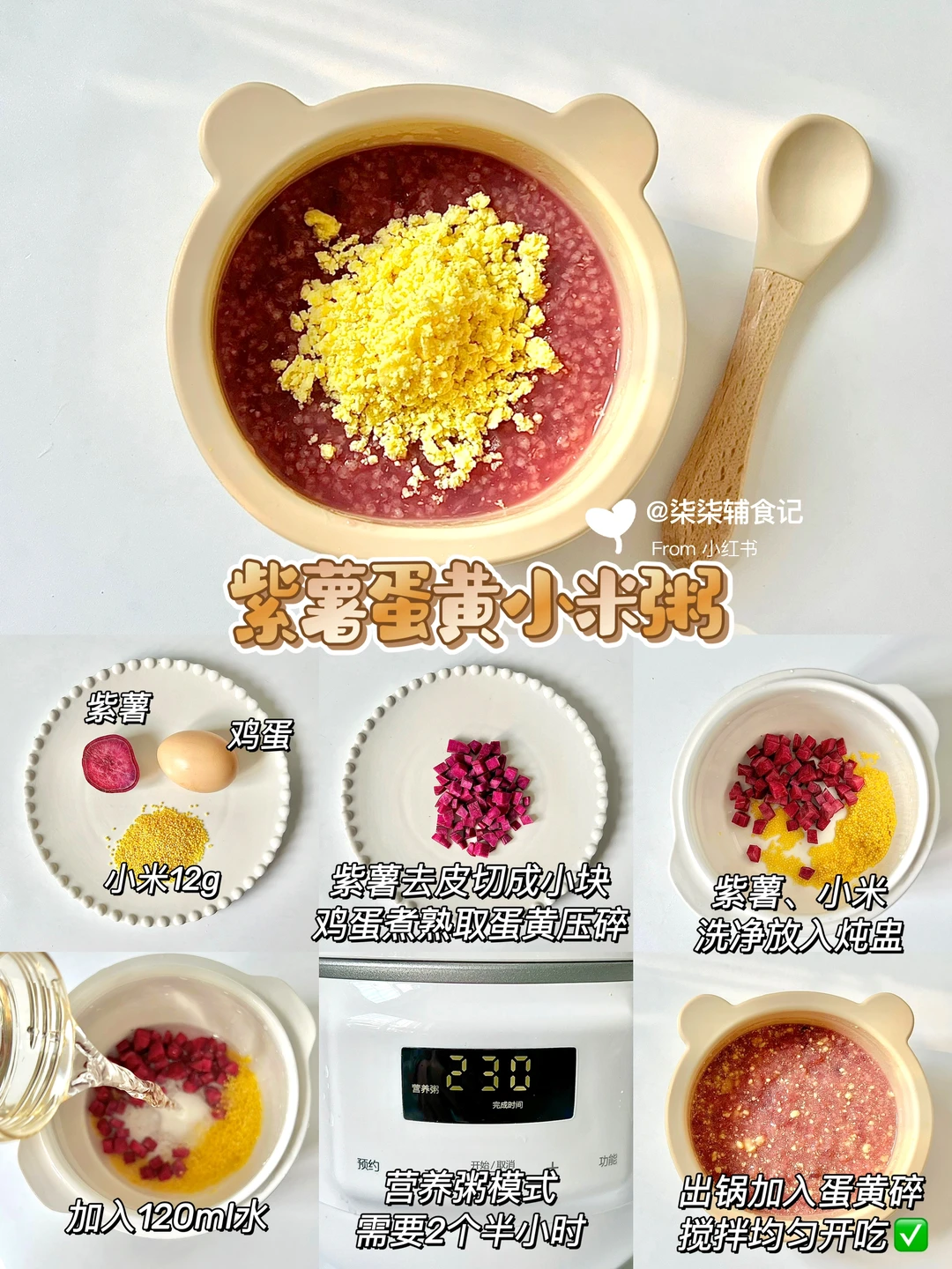 中午吃紫薯蛋黄小米粥,紫薯煮完颗粒太大可以用勺子压碎再吃,大一点的宝宝咀嚼能力好,可以直接吃。