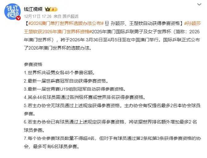 别只盯着孙颖莎王楚钦的混双了。2026年澳门世界杯,真正的厮杀在这里。 规则变了。48人规模,名额看似多了,但新生代正在疯狂卡位。张本美和、勒布伦兄弟,这些名字会挤掉一堆老将。靠排名?莎莎和大头稳,但规则里还卡着一道“洲际杯赛”。 孙颖莎面前,摆着一个历史任务:她集齐了奥运金牌,独缺一个世界杯单打冠军。王楚钦要跨越的,是从绝对核心到巅峰王座的最后一级台阶。2025年世乒赛,成了必须冲刺的“准考证”。 澳门已经启动“体育+”计划,奖金池拉到150万美元。这不只是一场比赛,是巴黎后新时代的开幕战。他们的单打表现,直接决定“莎头”这个价值两千万的组合,是升级还是转型。 看巨星夺冠是圆满,看巨星为一张门票拼命才是顶级戏剧。2026年澳门,见证的不是卫冕,而是闯关。