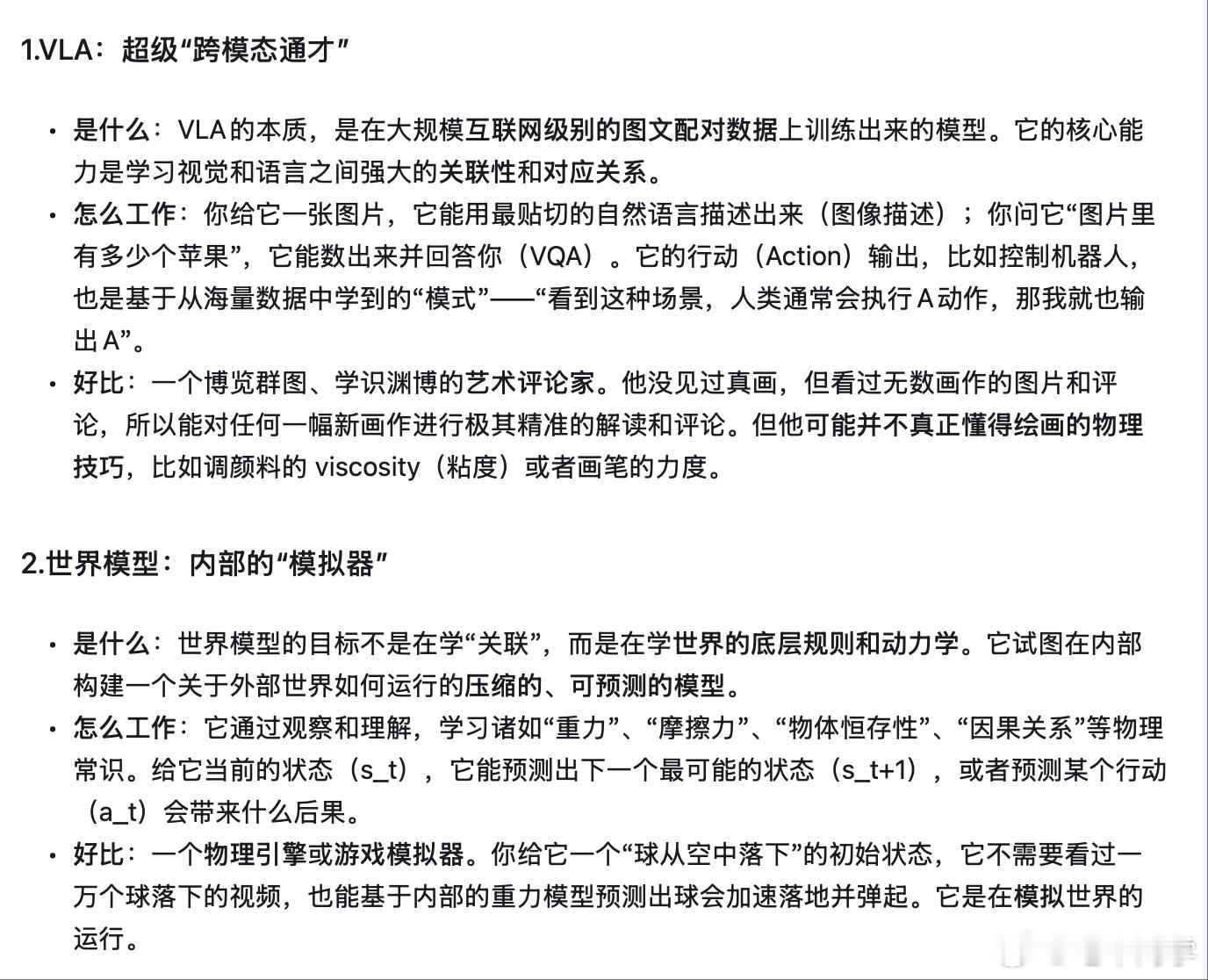 这个解释好通透VLA好比艺术评论家,博览群图、学识渊博,但他可能并不真正懂得绘画的物理技巧。世界模型更像一个物理引擎或游戏模拟器。分享给大家。大v聊车