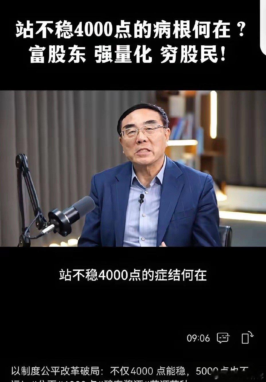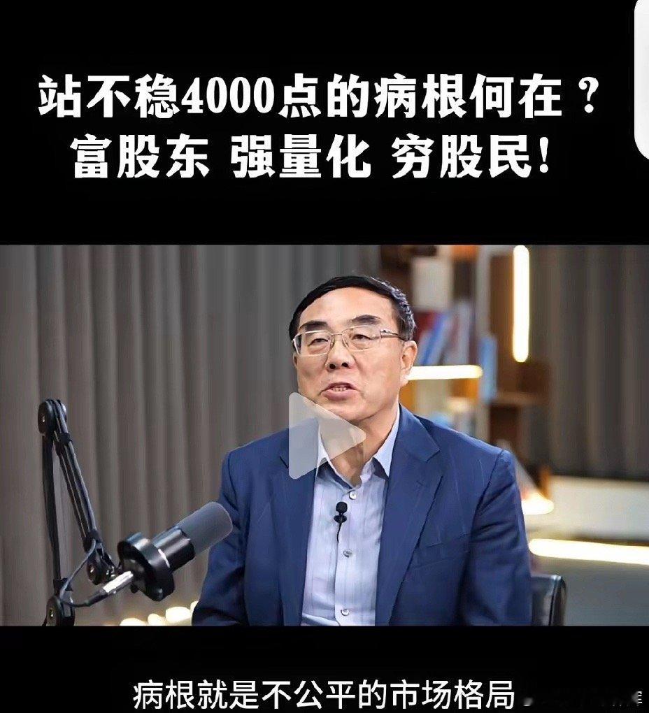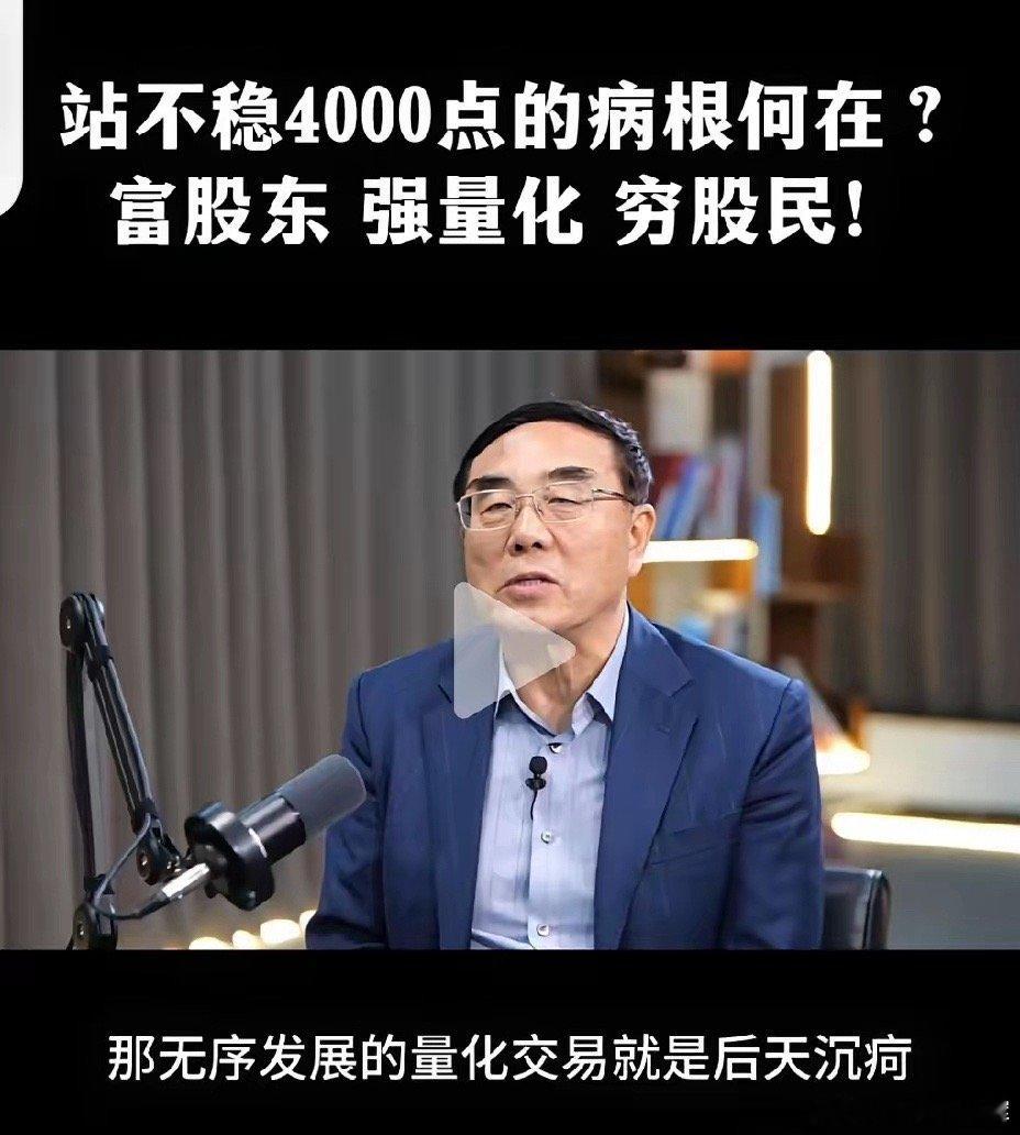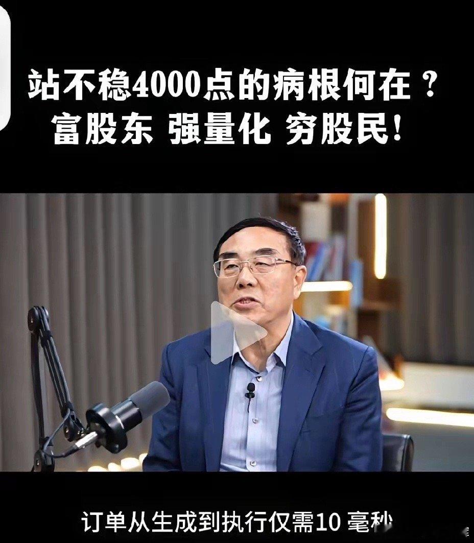 刘纪鹏真敢说!!刘纪鹏最新视频:为什么站不稳4000点?主要现在的股市的现状是:富股东、强量化、穷股民。1、必须约束大股东减持。小编曾经在去年刘教授呼吁约束大股东减持的提议中做了笔记,股市涨了点,股东就减持,股民会有信心吗?约束的具体措施是:①上市公司分红的金额必须达到IPO募集的资金数额之后,才允许上市公司减持,大股东分走的红利要扣除。②、减持的价格不能低于IPO的价格。③、对于现在的契约减持要取消80%的优惠价。④、受让方拿到的股份一定要两年以上才能流通……2、必须停止量化交易,量化一日不停,股市一日不宁。提到量化,大家都知道,它很快,订单从生成到执行,只需10 毫秒。机房直连交易所,指令传输只要1.2毫秒。比散户快300多倍。信息搜索更加厉害,AI爬虫7*24小时,紧盯20多个国家发改委等官媒信息公布。能在0.3秒内扫描全网信息和热点分析。量化机构有制度特权,既能够通过融券实现多空双向近似于T+0的手段 ,还能从券商那里拿到优质劵源。交易成本非常低。刘纪鹏教授提出:必须以制度公平改革破局!不仅4000 点能稳,5000点也不远!