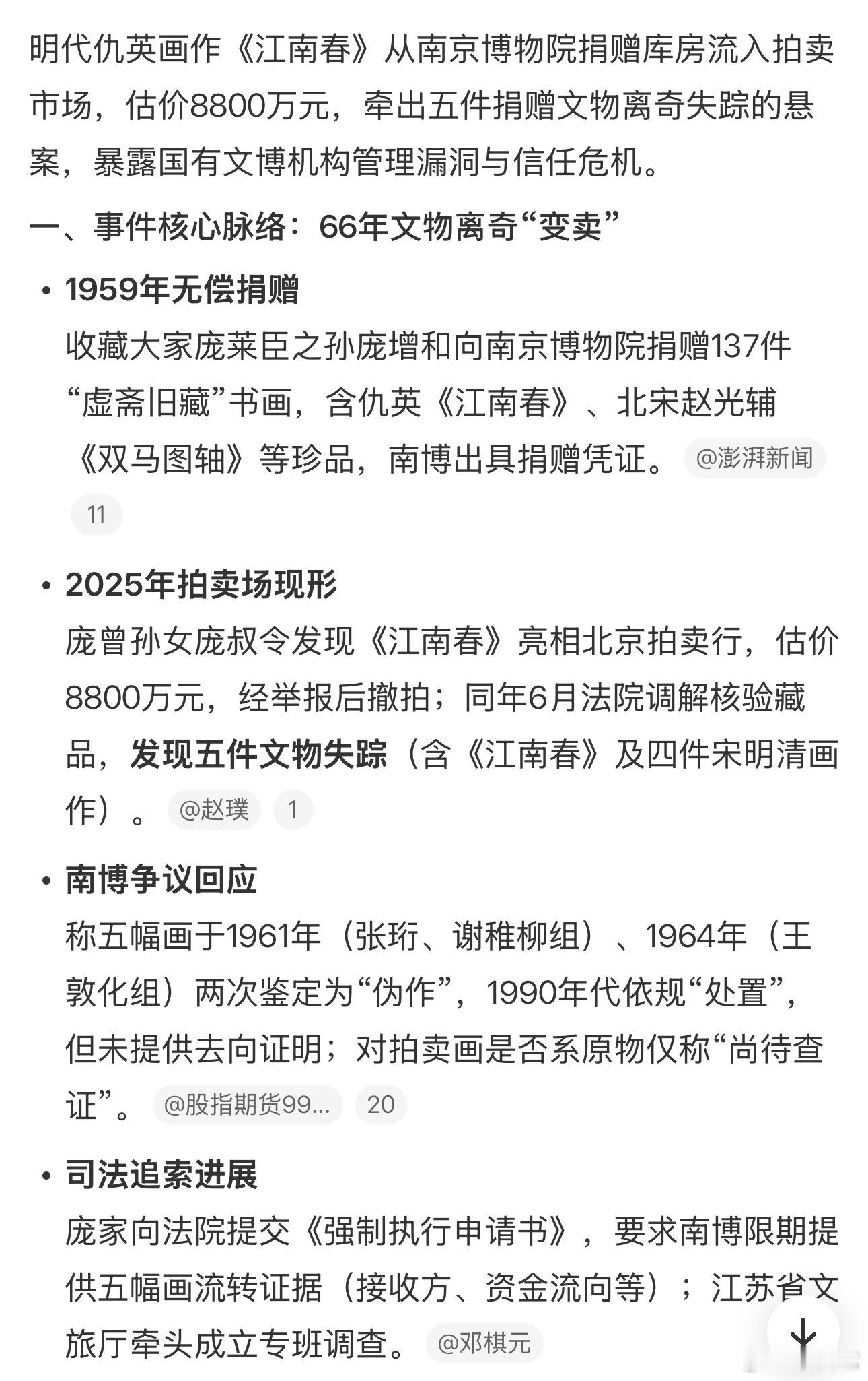 ‼️ 南京博物馆馆藏明·仇英的《江南春》出现在嘉德春拍,起拍价八千八百万。 捐赠者著名收藏家庞莱臣的后人发现后举报,嘉德随即撤下该拍品。 庞家后人要求追查此事,南京博物馆回复:此画为伪作。 那是嘉德走眼,伪作起拍8800万。其二,如果真是伪作,博物馆不想继续收藏,也应退还捐赠者处置。 1959年,庞莱臣共捐赠137件藏品,其中五件不知去向。国家文物局调查博物馆藏画拍卖事件 江苏文旅厅回应名画现身拍卖市场南京博物院将深入核查争议画作去向国家文物局回应博物馆藏画疑被拍卖
