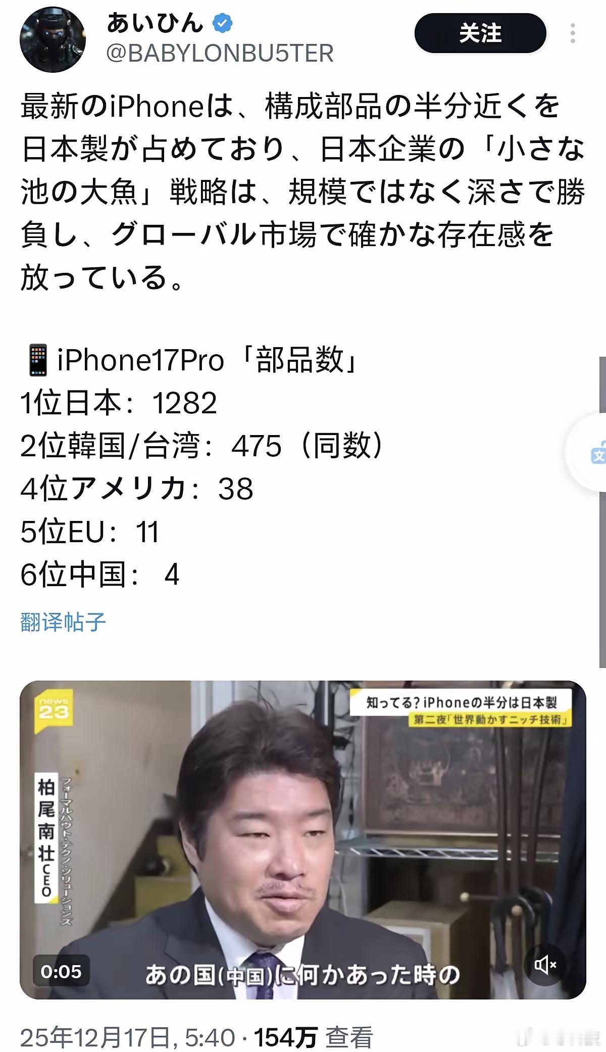 日本人说:在最新款iPhone中,日本制造的零部件占比近半,这是想当第一制造大国想疯了吧!