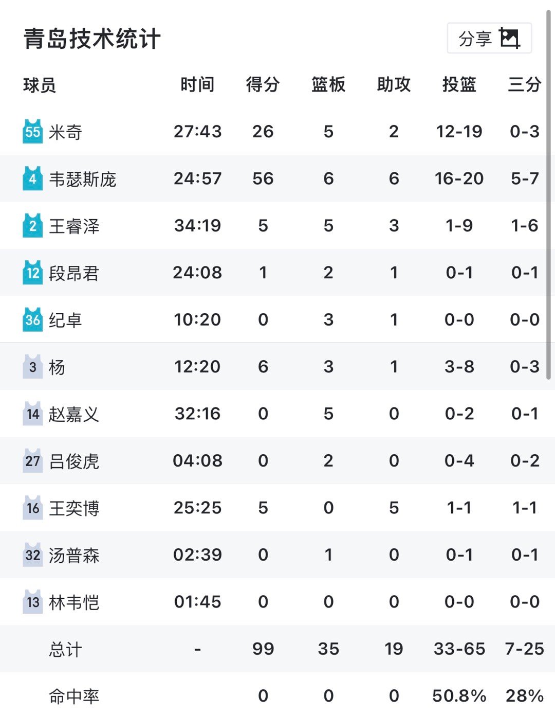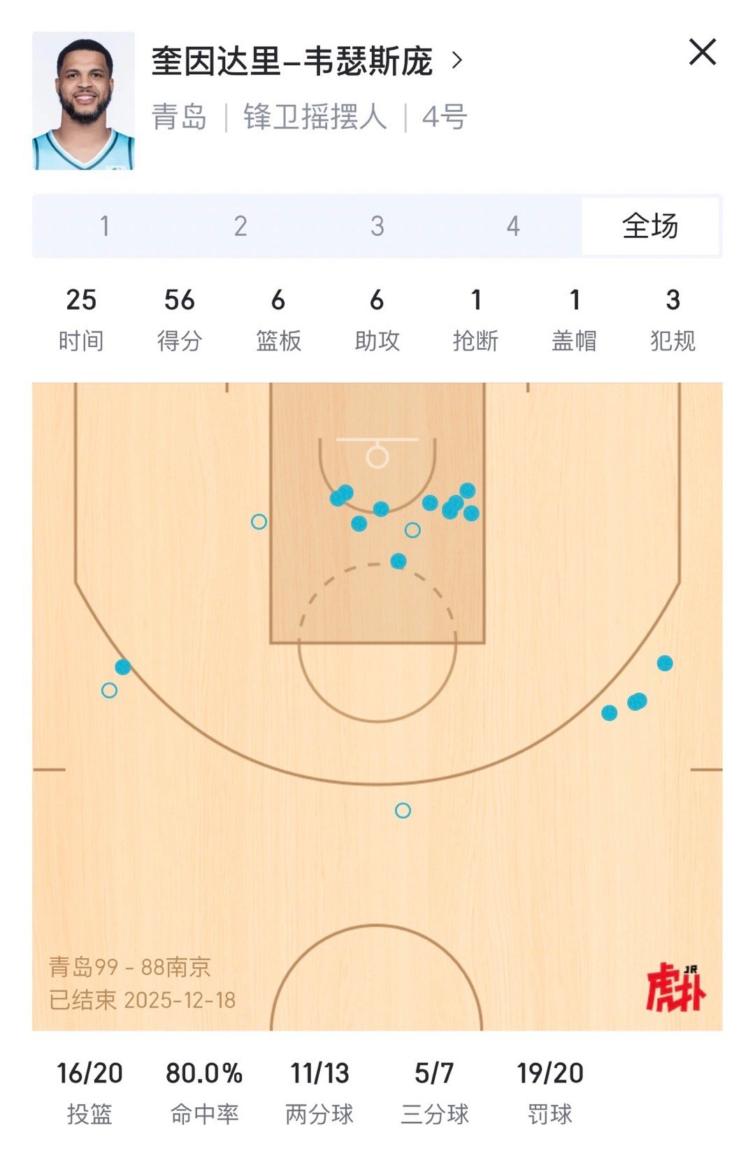 青岛99-88战胜南京,青岛全队得到99分,外援合砍88分,威瑟斯庞独得56分!20投16中,罚球20中19,太残暴了!