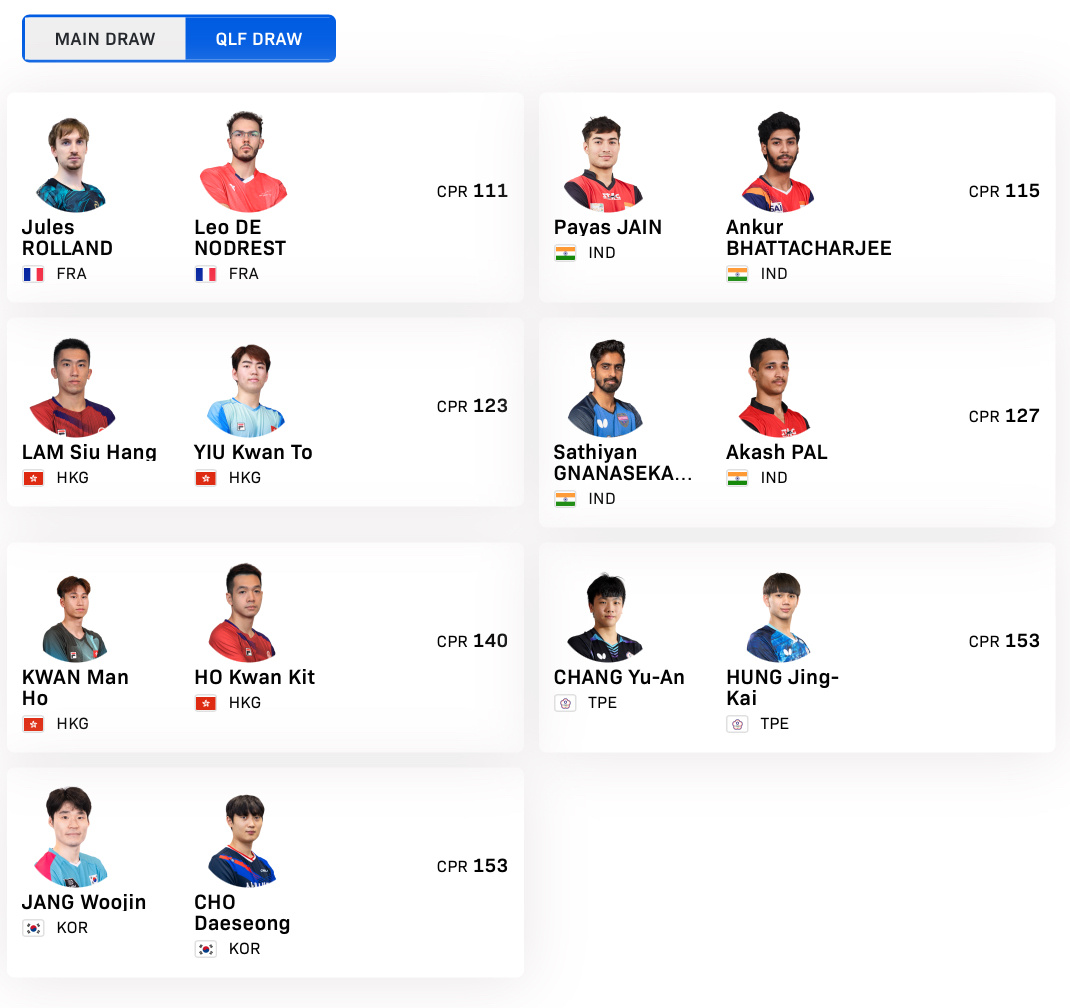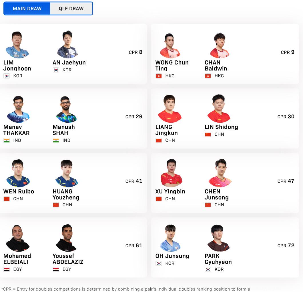 WTT球星挑战赛多哈站2026【男双参赛名单】比赛时间:1.13-1.18正赛: