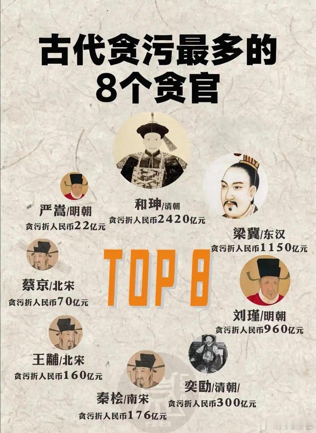 中国古代8大贪官东汉梁冀,汉顺帝皇后梁妠、汉桓帝皇后梁女莹的哥哥。穷极奢侈,拓建林苑,制同皇家,方圆近千里,掠民数千为奴婢。北宋王黼,贪污6200万两白银,相当于当时国库收入的一半以上。北宋蔡京,宋朝第一贪官。南宋秦桧,开门受赂,富敌于国。明朝严嵩,明朝第一贪官。明朝刘瑾,为国敛财,不择手段。清朝和珅,清朝第一贪官。清朝奕劻,清朝即将灭亡,还在贪污。