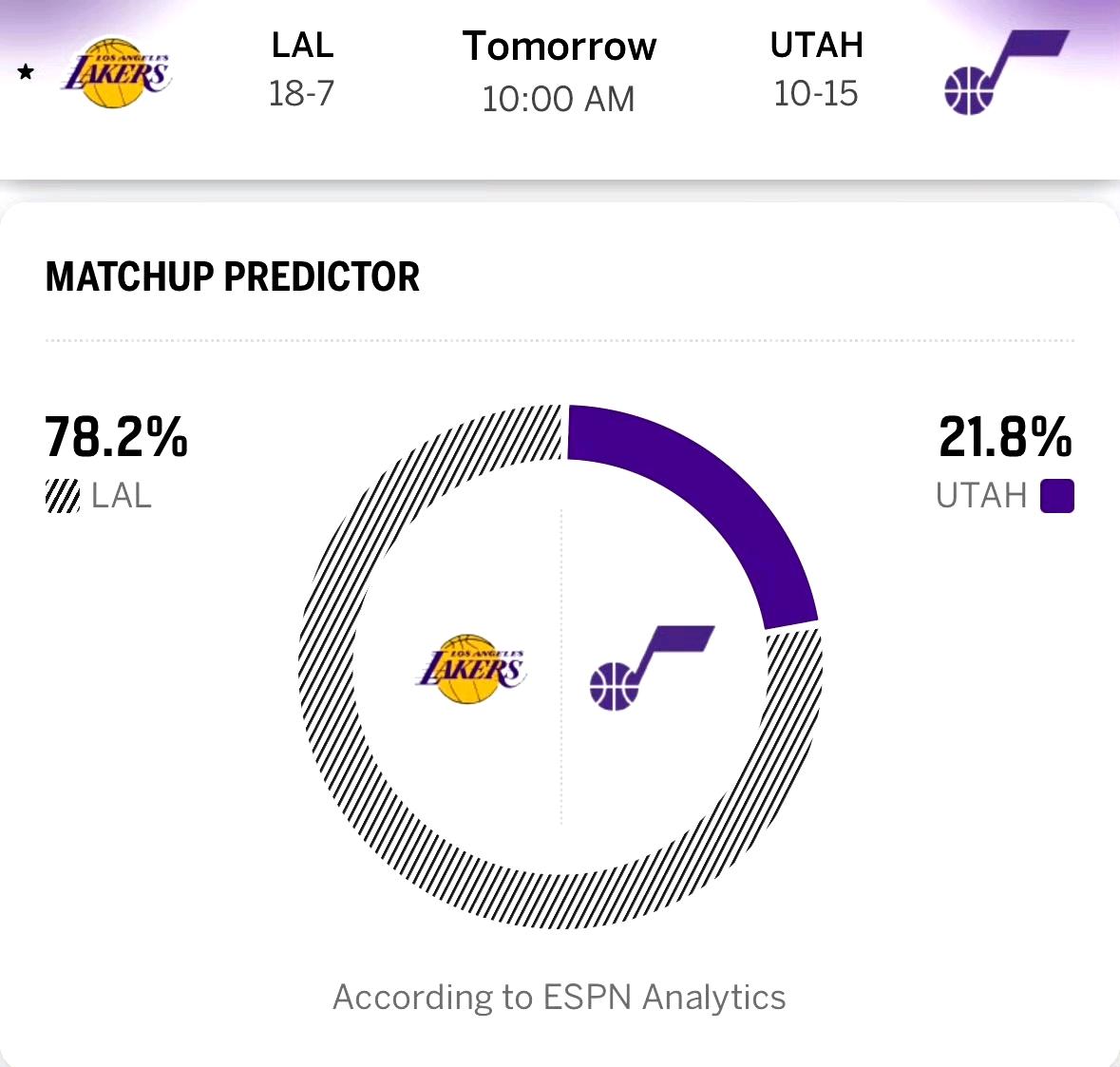 西部也要重新洗牌了!灰熊最近11场比赛8胜3负,击败森林狼后,灰熊目前与勇士持平。赛季初勇士还占据过西部榜首几天,如今混得这么惨…… 今天湖人客场对阵爵士,艾顿里夫斯缺席,诈骗犯文森特下背部肌肉紧张再次缺席。 ESPN给出获胜概率:湖人78.2%、爵士21.8%。指数:爵士+7.5。 这么高的胜率,是将湖人放在火上烤……