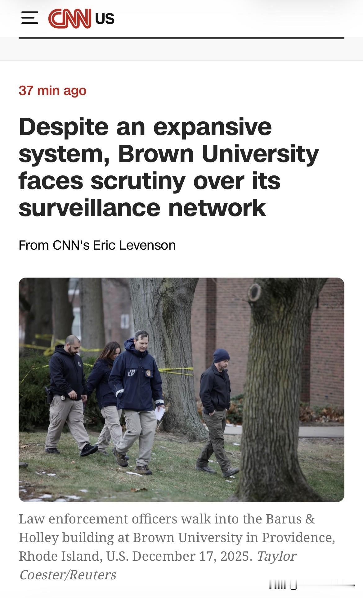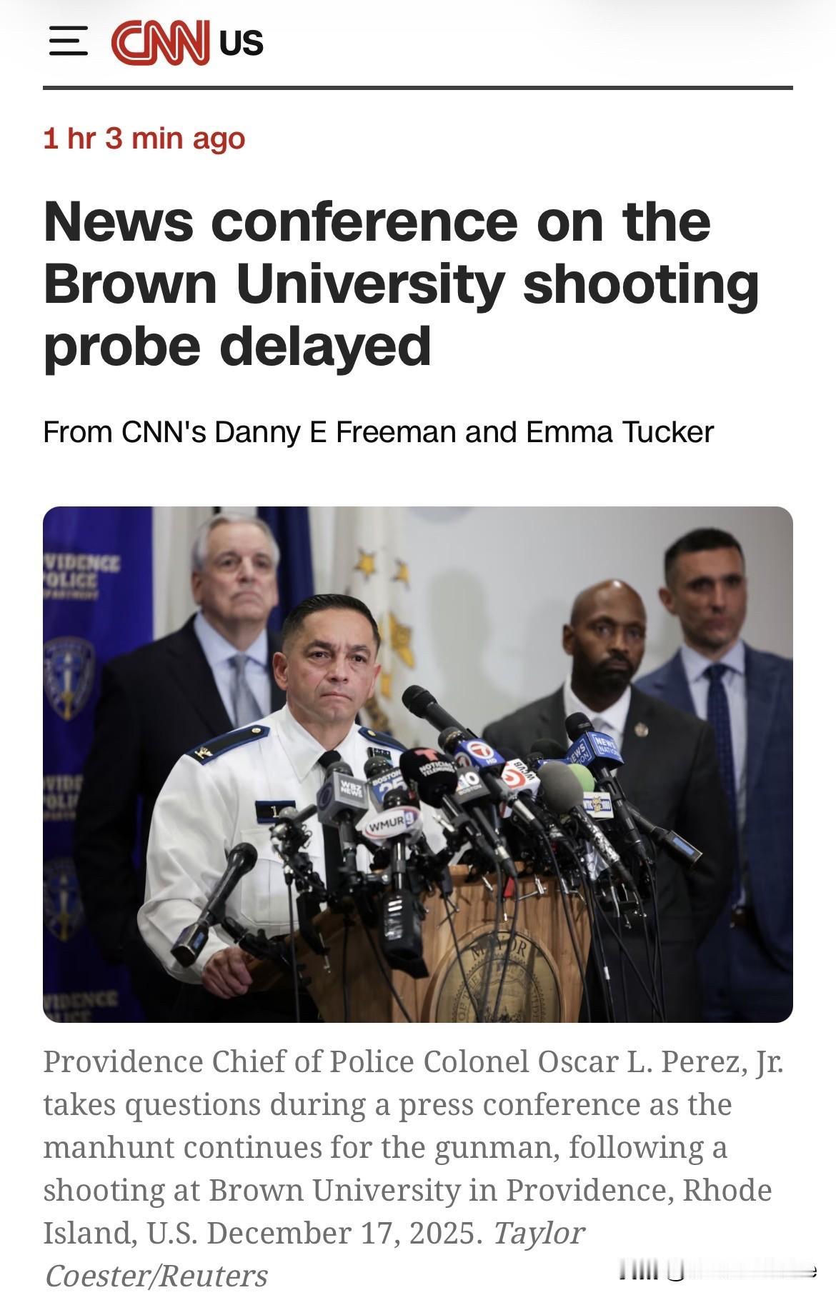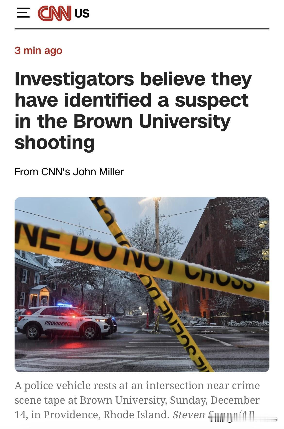 CNN最新消息:据两名熟悉此案的执法官员称,调查人员认为他们已经确认了布朗大学枪击案的嫌疑人。 当局已签署逮捕该嫌疑人的逮捕令,目前正在寻找他。