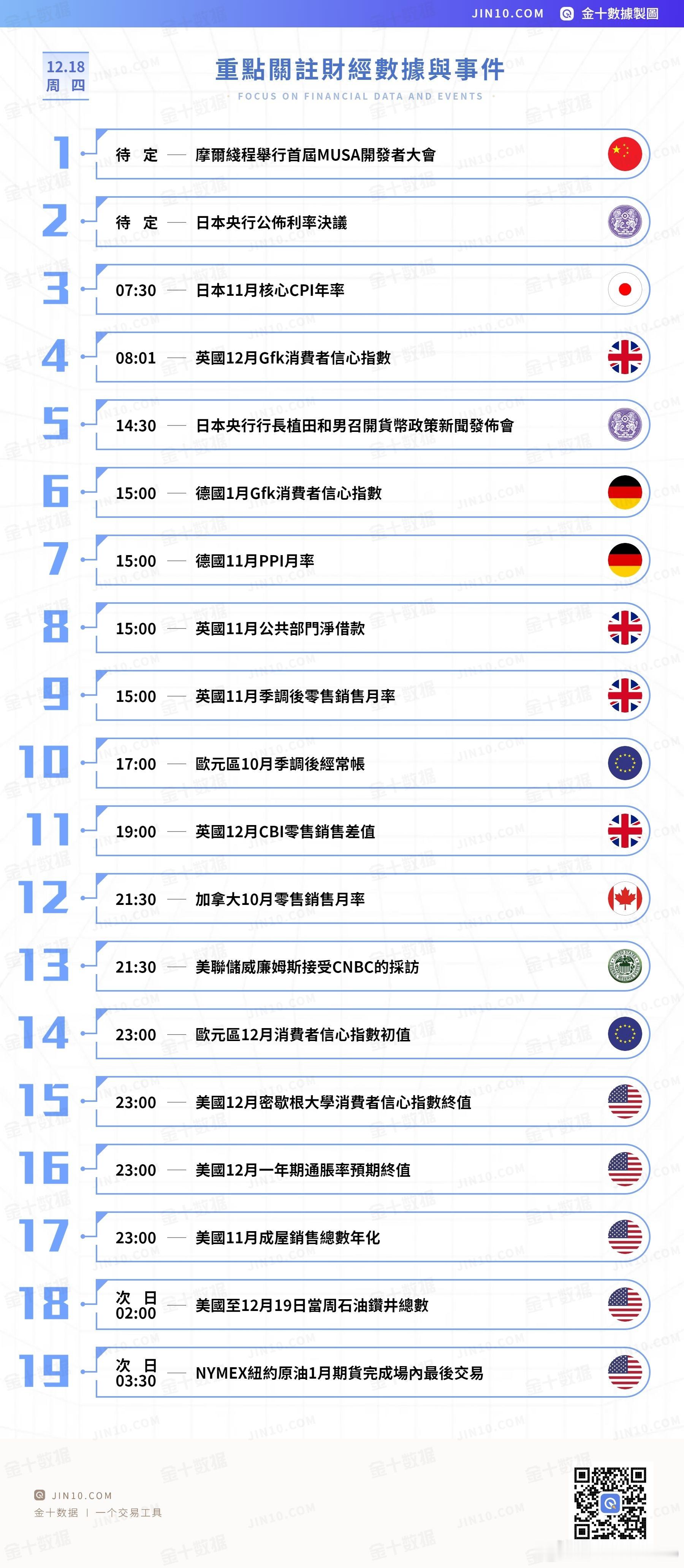 今日重点关注的财经数据与事件:① 待定 摩尔线程举行首届MUSA开发者大会② 待定 日本央行公布利率决③ 07:30 日本11月核心CPI年率④ 08:01 英国12月Gfk消费者信心指数⑤ 14:30 日本央行行长植田和男召开新闻发布会⑥ 15:00 德国1月Gfk消费者信心指数⑦ 15:00 德国11月PPI月率⑧ 15:00 英国11月公共部门净借款⑨ 15:00 英国11月季调后零售销售月率⑩ 17:00 欧元区10月季调后经常帐⑪ 19:00 英国12月CBI零售销售差值⑫ 21:30 加拿大10月零售销售月率⑬ 21:30 美联储威廉姆斯接受CNBC的采访⑭ 23:00 欧元区12月消费者信心指数初值⑮ 23:00 美国12月密歇根大学消费者信心指数终值⑯ 23:00 美国12月一年期通胀率预期终值⑰ 23:00 美国11月成屋销售总数年化⑱ 次日02:00 美国至12月19日当周石油钻井总数⑲ 次日03:30 纽约原油1月期货完成场内最后交易(来自金十数据App)