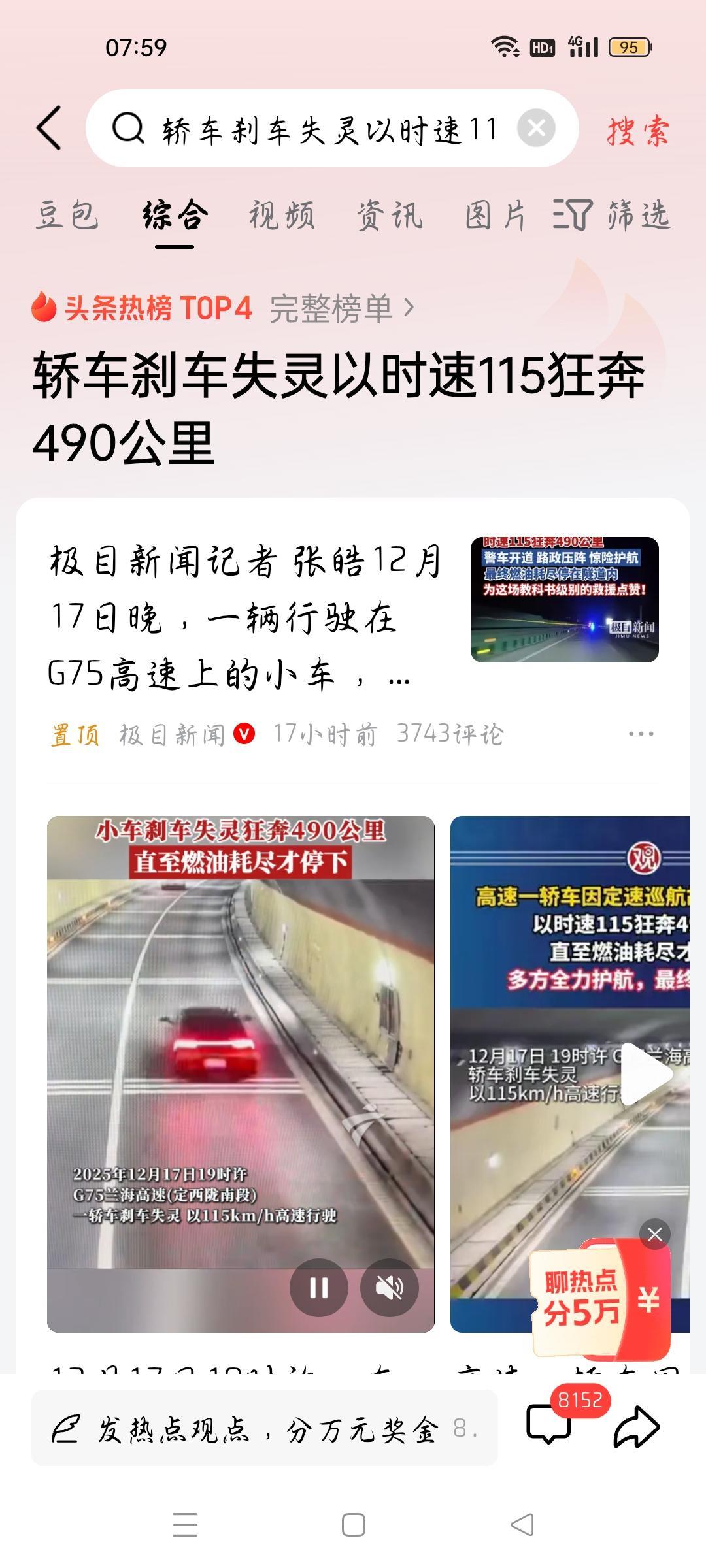 轿车刹车失灵以时速115狂奔490公里,我想说 据极目新闻报道,12月17日晚,兰海高速一小车定速巡航故障刹车失灵,怎么办?驾驶员向高速交警求助,接警后,交警开道,路政压阵,以时速115狂奔490公里,最终燃油耗尽停在隧道内,我想说,定建故障刹车失灵,个人认为,年轻人没有在上高速检查,还有所有的所谓自动化,都可能失灵,有网友还是刹车掌握在自己的脚更稳当了,通过这起事故,个人认为,有 没有备用方案,或者生产一种既可自动又可以脚动的机器。当然不少人认为这位年轻人碰到这种情况的概率极低,低不等于没有。所以还需改进刹车装置的技术。各位条友觉得呢?