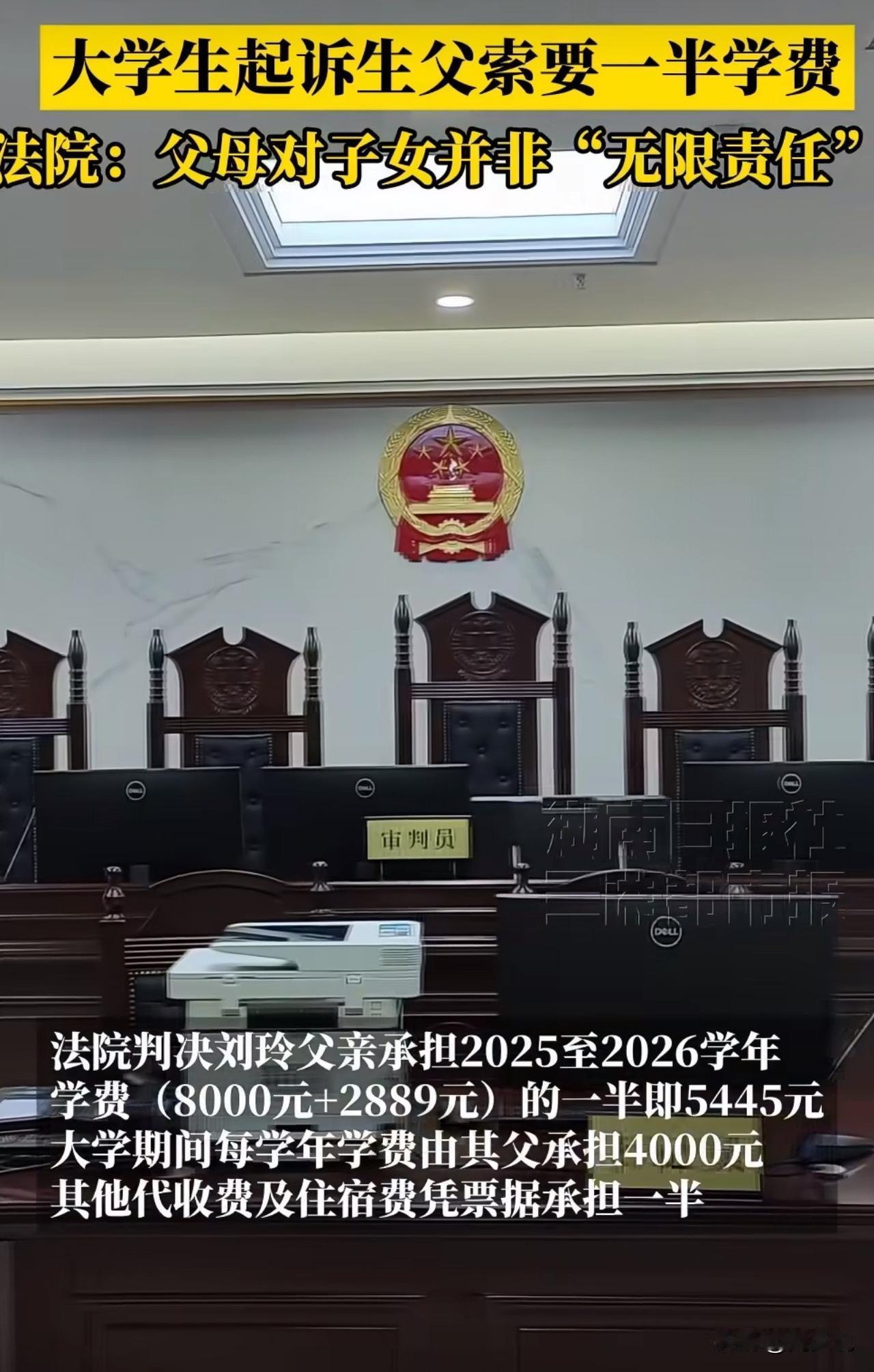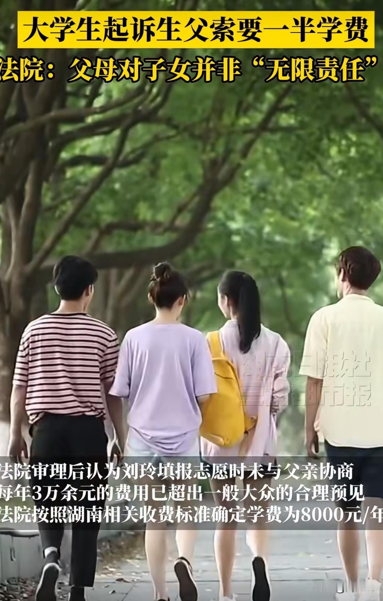 “湖南渌口一起抚养费纠纷案火了!”女儿考上美术专业,每年学费近3万,生父无力承担竟被起诉,法院的判决引热议。 张辉与前妻离婚时约定,支付女儿生活费至大学毕业,共同承担学费。女儿选了高收费美术专业后,因母亲无力负担,便将无固定工作、需承担医疗费的生父告上法庭。 法院审理后认定,父母对成年子女的教育费并非无限责任,结合生父能力,判决其按普通高校学费标准承担一半费用。 此事网友看法不一,有网友说: “不是生父不负责任,高价专业是孩子自己选的,不能把压力全甩给父母!” 也有网友表示: “这个判决太清醒了!给孩子上了一课:成年人要为自己的选择买单。” 看完这事,周少认为这场官司藏着深刻的教育启示:很多孩子误以为父母的付出天经地义,却忽略了父母的承受边界。 真正的家庭教育,不仅要教孩子追梦,更要让他们懂得体谅父母的不易,学会为自己的选择负责。这起判决,既是给家长松绑,更是给孩子上的一堂成长必修课。#寻美三湘# #长沙新朋友#