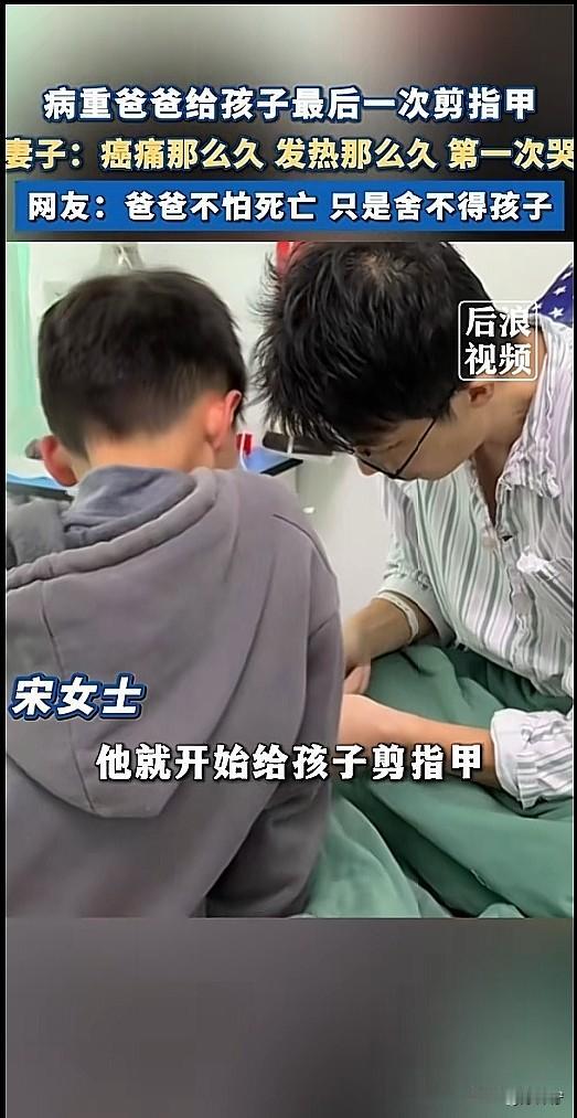 这一幕看哭无数人!河北一位38岁的父亲,用生命最后的力气,给孩子剪了一次指甲,全是对孩子的不舍与牵挂。 10月查出肝脓肿住院,才一个月,病危通知书就来了。这位父亲,扛过了无数次高烧剧痛,从没掉过一滴泪,可当看到一双儿女跑进病房的瞬间,再也忍不住,眼泪唰的就下来了。 他颤抖着拿起指甲刀,给一双儿女细细修剪指甲,妻子在旁边劝他歇会儿,他摇摇头,说:“我想再给孩子剪一次”,语气里满是不舍。剪完指甲,他把孩子搂进怀里,一遍又一遍地说:“要听妈妈的话,要好好的”。 11月12日清晨,这位父亲再也没能醒来,临走前,他望着妻子和孩子,默默流泪,那是他对这个家最后的眷恋。 38岁,是家里的顶梁柱,是孩子的天。他走的时候,心里该装了多少牵挂啊,那剪指甲的手,藏着一个父亲深深的不舍。 生离死别,最疼的莫过于,我还想陪着你长大,却再也没有机会了。 父亲 孩子 剪指甲