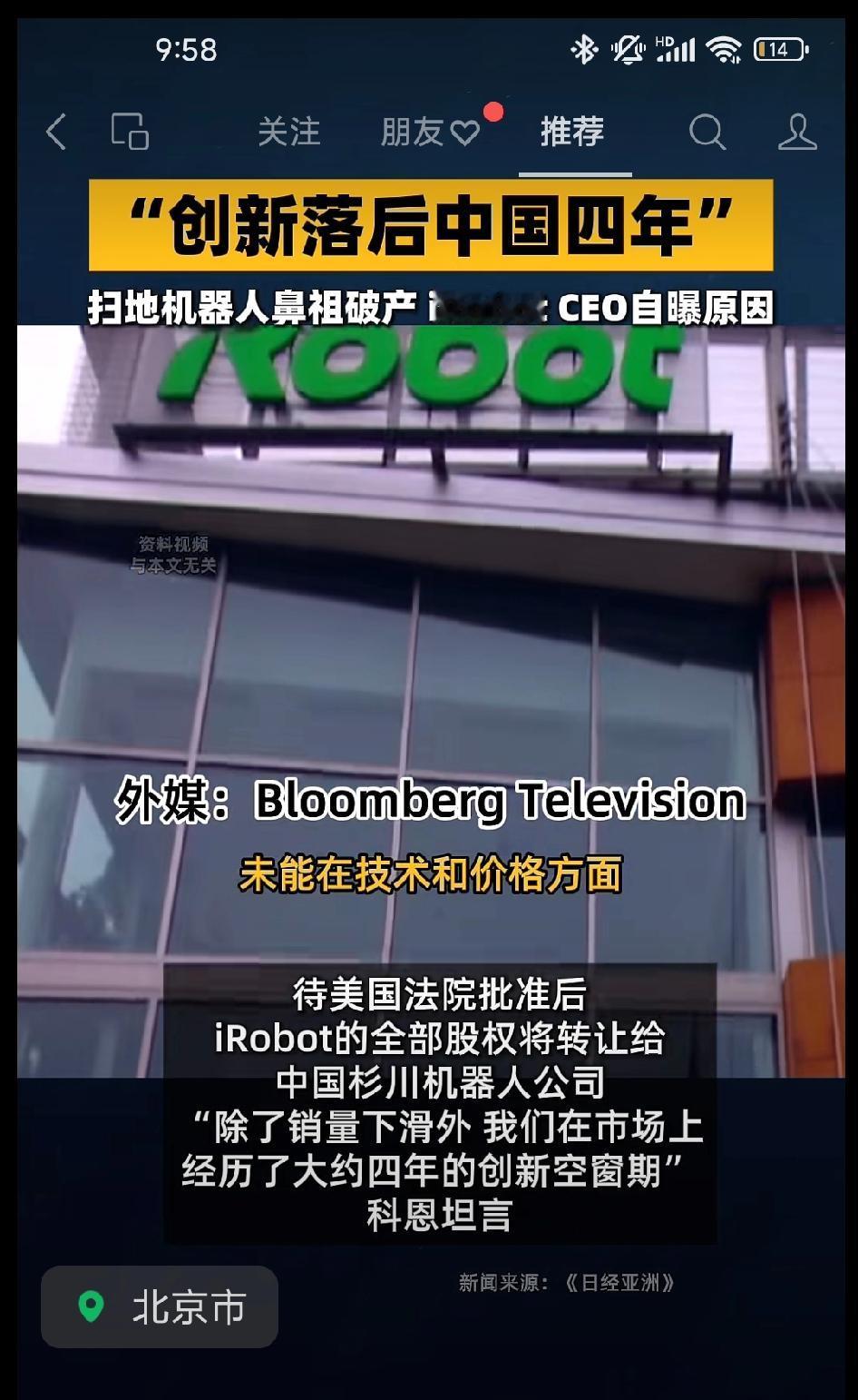 扫地机器人鼻祖iRobot破产,CEO自爆原因 2017年全球扫地机器人领域,iRobot的市场占有率超过50%,但今年1~9月,这一占比已降至7%。 CEO坦言:我们未能实现创新,没有推出更具竞争力的产品,除了销量下滑外,我们在市场上经历了四年产品创新空窗期。 中国竞争对手不仅更具有价格优势,在功能上也超越了iRobot。一台中国扫地机器人就能完成整层的清扫工作。 后期,待美国法院批准后iRobert的全部股份将转让给中国杉川机器人公司。