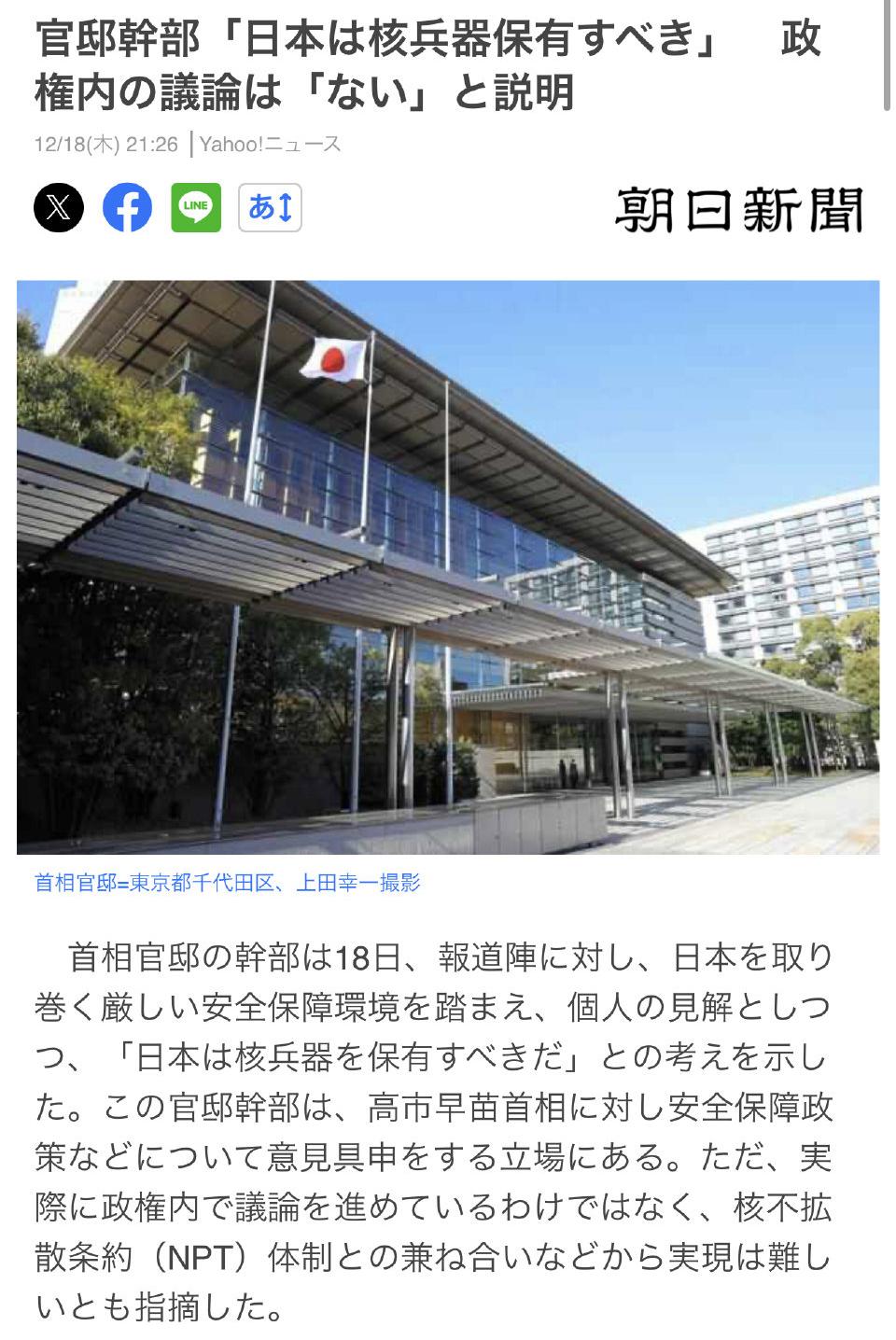 日本首相官邸的一位高级官员最近公然宣称:他认为日本应该拥有核武器。这番话立刻引起了轩然大波。 这位官员的身份很特殊,他负责就安全政策向首相提供建议。他在采访中表达了对周边安全环境的担忧,认为中国、俄罗斯和朝鲜的核力量在增强,而美国的核保护伞未必完全可靠。因此,他觉得日本有必要自己拥核来进行威慑。但他同时强调,这只是他个人的想法,日本政府内部并没有就此展开正式讨论。 尽管如此,这番话被视为一次危险的政治试探。它并非凭空出现,而是与日本国内近期一些动向相呼应。比如,现任政府在“无核三原则”上的表态有时显得模糊,部分政客也在讨论为美军核武器进入日本铺平道路的可能性。 从技术层面看,日本确实拥有不容忽视的潜力。它囤积了大量的核材料,具备先进的火箭和潜艇技术,理论上拥有在较短时间内制造核武器的能力。右翼势力所设想的“核共享”模式,也旨在通过加强与美军的核协作,变相获得核威慑力。 然而,这条路面临着巨大的国内外阻力。在日本国内,广岛、长崎等地的民众强烈反对,许多政治人物也坚持“无核三原则”是不可动摇的国策。在国际上,中国、俄罗斯等国已发出严厉警告,国际原子能机构也对日本的核材料流动保持着严密监控。更重要的是,和平宪法和相关法律构成了根本性的限制。 所以,这位官员的言论更像是一次投石问路,测试国内外的水温。它暴露了日本政坛一部分人对“核武装”的幻想,但也清晰地展示了横亘在前的法律、技术和政治障碍。在可预见的未来,这更可能是一场停留在口头上的博弈,但其释放的危险信号,已足以让整个东亚地区感到警惕。核弹日本 日本核武争议 日本要拥核