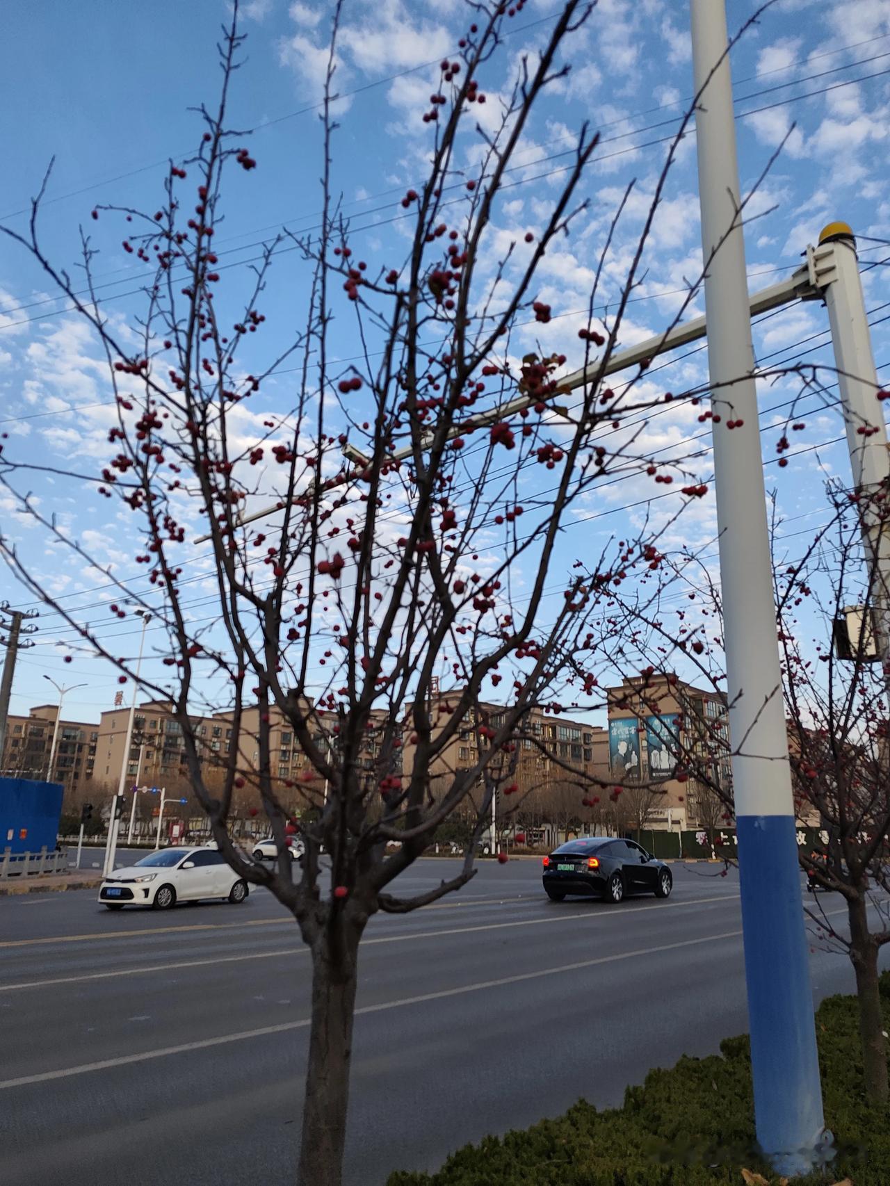 你说冬日的街头,蓝天衬着碎碎的白云,路边的树落光了叶子,只剩红果果挂在细枝上,这倒添了几分鲜活。马路上车来车往,白的黑的小车滑过路面,蓝白相间的路灯杆立在一旁,风一吹,枝桠轻轻晃,红果果也跟着摇,冷飕飕的天里,倒看出点热闹的滋味来。你说这果能吃吗?