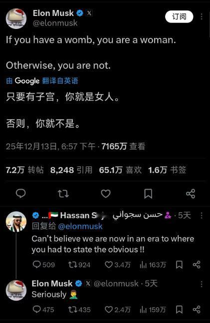 马斯克,地球上最有钱的男人,发了条推特。他说,有子宫的才是女人,没有的,就不是。 这条推文直接定义了一个足以引发全民争论的话题,瞬间点燃了全网的讨论热情。 有网友调侃“作为高中化学差点及格的人,我都能证实这是对的。” 有人感慨“整个人类历史上都无可争议的事实,现在却要假装存在争议,就为了不冒犯性别研究专业的学生。” 还有人提到子宫切除术患者,愤怒表示“这种单一标准既荒谬又伤人”,不少跨性别群体支持者更是直接表态“跨性别女性也是女性,性别认同不该被生理特征绑架”。 两种声音激烈碰撞,每条评论下都有上千点赞和再回复,形成了一场全民参与的舆论论战。 没过多久,加州州长纽森办公室转发的一条采访片段就出现在了公众视野,纽森在采访中提及自己有个跨性别教子,还明确表态自己是最支持跨性别立法的州长,配文却精准戳向马斯克的家庭私事:“说得对。很遗憾你的女儿讨厌你。” 很显然,这个所谓的女儿就是马斯克的长子。 公开信息显示,薇薇安在16岁时便开始接受变性治疗,刚满18岁,便立刻向法院提交申请,与马斯克断绝了所有形式的亲属关系,彻底割裂了与这位首富父亲的关联。 更引人注意的是,薇薇安此后多次公开抨击马斯克,称其是“自恋、冷漠、自私的人”,甚至直言马斯克在对百万观众撒谎,这段父子间的裂痕被媒体反复曝光,如今成了政客交锋的武器。 马斯克对觉醒文化的深恶痛绝并非空穴来风,儿子的变性与决裂显然给他带来了极大的心理冲击。 值得注意的是,马斯克的强硬回应看似是维护自身立场,实则暴露了他在家庭情感表达上的笨拙,他习惯了用指令式的强硬态度面对一切,这种在商业领域或许有效的风格,在家庭关系中却彻底失效,最终导致了父子关系的彻底破裂。 有网友感慨“原来有这么多被忽视的群体,马斯克的定义太草率了”,也有网友质疑“数据的解读方向不同结论也不同,不能仅凭数据就否定生理基础”。 风暴不会轻易平息,它会持续在网络发酵。 网友们的讨论还会继续升级,支持与反对的阵营会持续拉锯,这场关于性别定义的争论,本质上是不同价值观的碰撞。 只是不知最终会有什么样的结局。 对于这件事,您有什么想说的吗?欢迎评论区留言讨论。