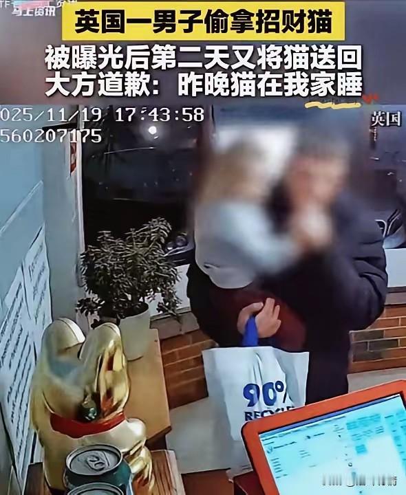 英国该男子彻底火了, 不光是在英国互联网上成了名人, 在中国的互联网上也很有名, 他出名的原因居然是顺走的中餐馆的招财猫,当天他带着自己的孩子去吃饭, 结账走人的时候, 看到了吧台上面的招财猫, 由于非常的喜欢, 就趁店员不注意的时候, 招财猫放进了随身携带的袋子中, 中餐馆的老板也是网络达人, 将这段监控放上了互联网, 男子看到自己犯罪行为被拍的一清二楚,第二天就把招财猫归还了, 还来了去昨晚招财猫在我家很安全, 这幽默的话语化解了尴尬, 店主也是很大气, 直接购买了20多只招财猫, 提出消费满30就送招财猫, 这下再也不用担心招财猫被顺走了, 这要是在国内, 那可得闹的沸沸扬扬, 说不定店主还要报警, 但这可是在英国, 英国人的素质也没有想象的那么高, 店主在英国可能有所顾忌, 这才选择不报警, 当成一个乐子放在了互联网上! 大家对于英国男子顺走中餐店招财猫这事怎么看? 英国印象 招财猫咪 招财店猫 招财猫猫咪 招财吸金猫
