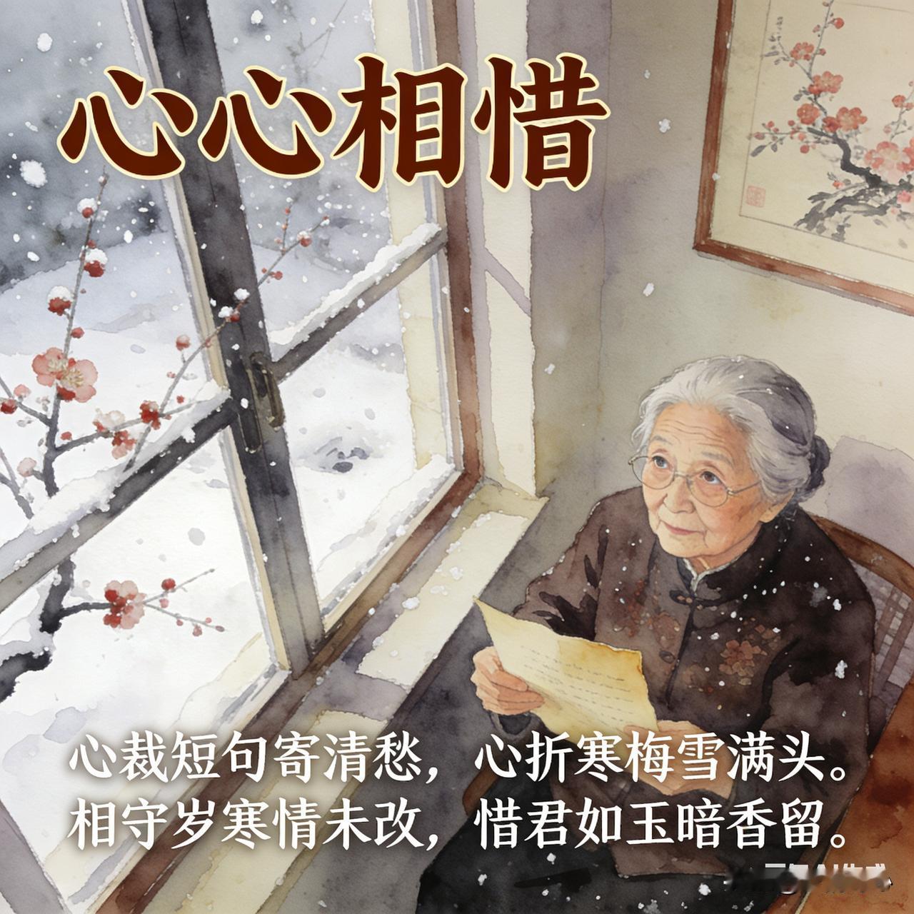 《心心相惜》乐韵诗心原创: 心裁短句寄清愁, 心折寒梅雪满头。 相守岁寒情未改, 惜君如玉暗香留。 《心心相惜》一诗深情动人,首句“心裁短句寄清愁”,表明用心创作短句来寄托内心的清愁。“心析寒梅雪满头”,对傲立雪中的寒梅心生折服,暗喻对高洁品质的倾慕。“相守岁寒情未改”体现出在艰难岁月里坚守情谊。尾句“惜君如玉暗香留”,表达对对方如美玉般的珍惜,情谊似暗香长久留存。
