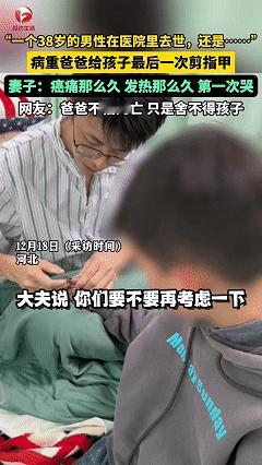 看哭了[流泪][流泪][流泪]河北这位爸爸的故事,眼泪根本忍不住往下掉。 38岁的汉子,扛过了癌症的剧痛和反复发热,从没掉过一滴泪,可见到两个孩子的瞬间,却哭得像个孩子。他没说一句舍不得,只是拿起指甲刀,小心翼翼地给孩子剪着指甲,那颤抖的动作里,全是说不出的牵挂。 原来最深的父爱从不是豪言壮语,而是临终前还想着把孩子的小事打理好。他知道自己陪不到孩子长大,就用最后一点力气,给孩子留一份藏在细节里的温柔。 生命真的太无常了,谁也不知道意外和明天哪个先来。我们总以为时间还多,却忘了有些告别根本来不及准备。 你有没有哪件想对家人做却一直没做的事?评论区聊聊~爸爸患癌症 爸爸瞬间落泪 癌症男人