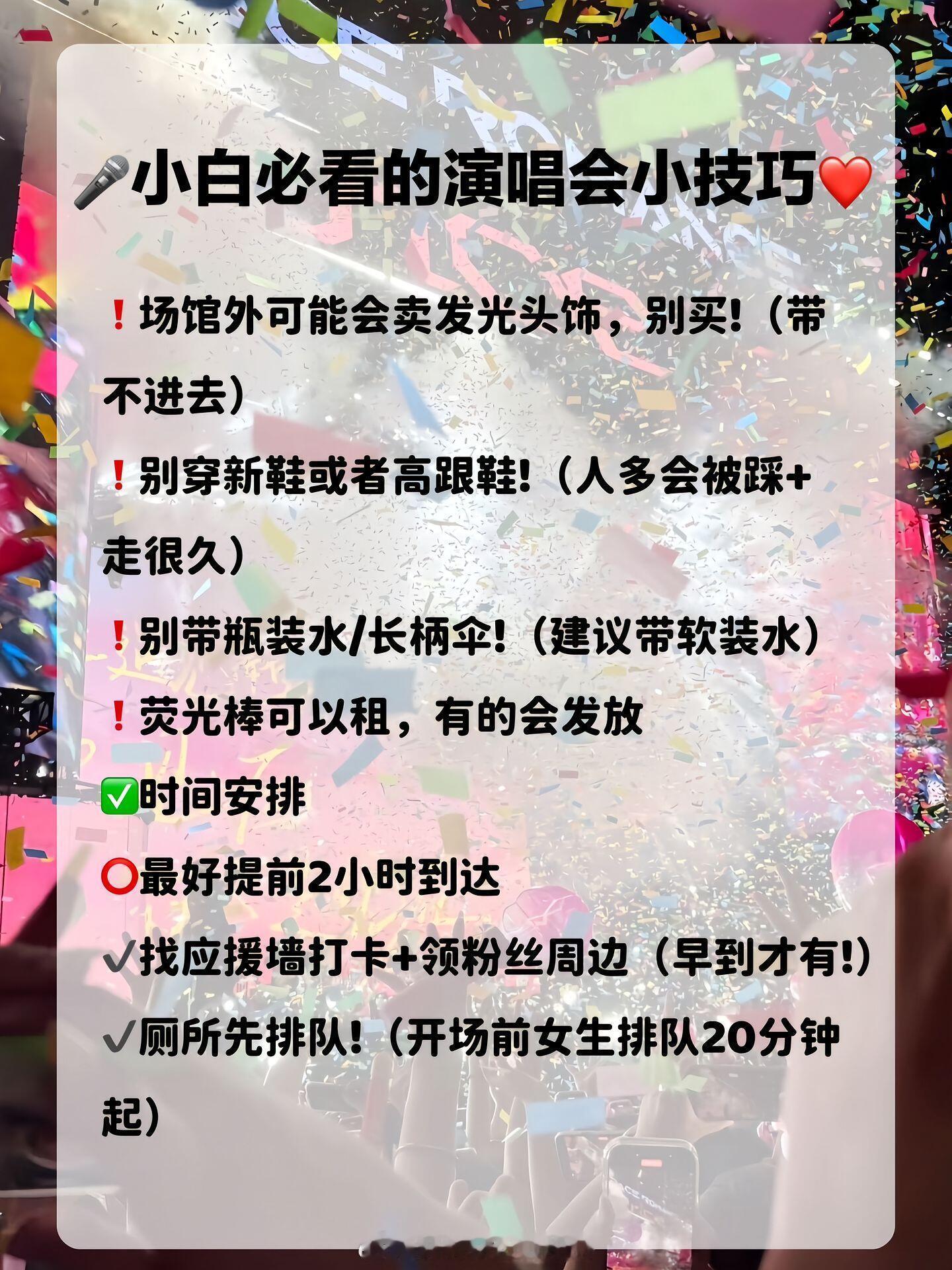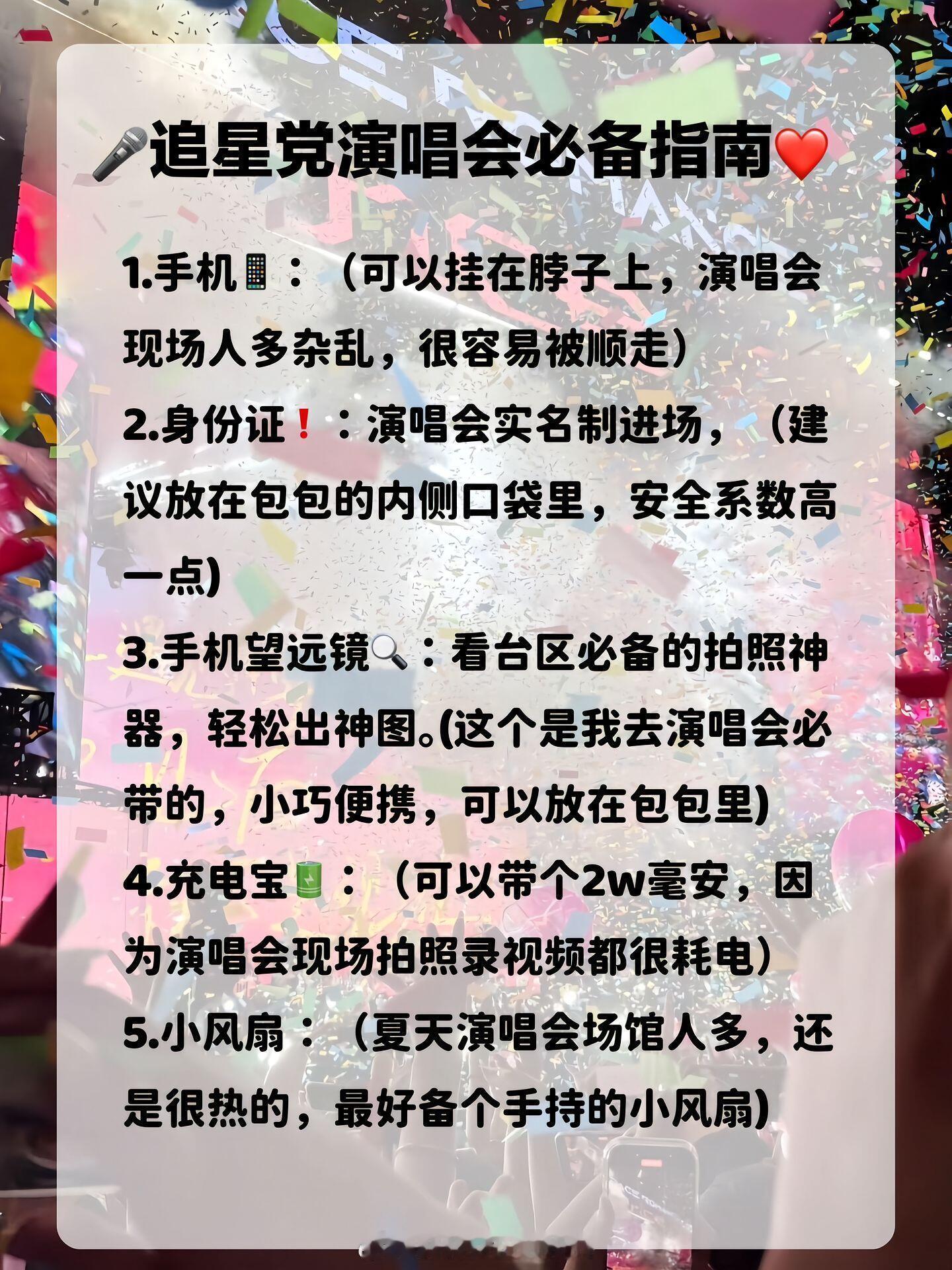 演唱会大型人类互助现场90后女生王力宏演唱会化身信号侠演唱会必备小系列,赶紧码住!✅ 【放心带系列】1. 长焦望远镜:我的救命神器2. 身份证+门票:电子票记得保证手机有电!3. 充电宝:2万毫安以下基本畅通无阻。4. 小包纸巾&湿巾:你会回来感谢我的。5. 少量现金:信号差时买水必备!祝大家都能安全入场,美美捕捉偶像的神颜!