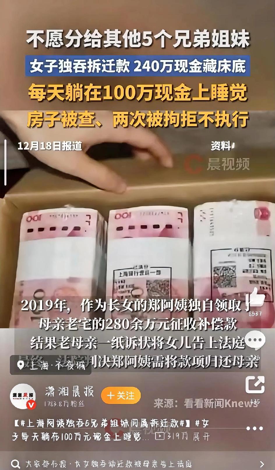 上海阿姨藏240万拆迁款拒分兄妹,法院搜出时现金还没拆封。 2019年上海虹口的一桩老宅拆迁,本该是全家受益的好事,却让一家六兄妹闹到对簿公堂。这事的主角是郑家大姐郑阿姨,她的户口一直落在母亲的老宅里,当年老宅被征收,能拿到280多万补偿款,郑阿姨没跟家里任何人商量,自己悄悄把这笔巨款全领走了。 老母亲得知后又气又急,这房子本就是自己的产业,女儿虽然户口在这,却从没实际居住过,还早就享受过福利分房,没道理独吞这笔钱。多次沟通无果后,老母亲只能把亲生女儿告上法庭。上海虹口法院审理后说得明明白白,这笔征收款归母亲所有,判决郑阿姨必须全额返还。 可谁也没想到,判决刚生效,老母亲就突然病逝了。这一来,本该还给母亲的拆迁款,就变成了遗产,郑阿姨和其他五个兄弟姐妹都有合法继承权。可郑阿姨早就被钱冲昏了头,根本不把法院判决当回事,一会儿说钱拿去理财亏光了,一会儿说凭证弄丢了,找各种理由拒绝给钱,硬是把兄妹关系逼到了冰点。 兄弟姐妹没办法,只能申请法院强制执行。法官分析了郑阿姨的生活和消费情况,觉得她根本不像把钱花光的样子,这笔钱大概率就藏在她家里。于是执行干警带着搜查令上门,一搜可真是开了眼——床底下的盒子里藏着100万现金,后续又在纸盒子、甚至牛奶盒里陆续找出更多现金,最后一算足足有240多万,很多现金的包装都还没拆封。 面对铁证,郑阿姨还想狡辩,说这些是自己的积蓄和儿子的工资,可根本圆不上谎,最后只能承认这就是当年的拆迁款。其实法院之前已经查封了她的房子,还两次对她采取司法拘留,可她就是抱着侥幸心理不肯低头。 不过法官也考虑到,郑阿姨作为长女,之前确实在照顾父母方面付出了不少,母亲的墓地钱也是她出的,加上她的实际生活状况,就想着能挽回家族亲情。于是法院组织调解,弟弟妹妹们念在手足之情,也体谅大姐之前的付出,最终同意减免部分迟延履行利息,双方达成了和解协议。 这场闹了好几年的家庭纠纷,终于靠着法律和亲情的平衡画上了句号。钱固然重要,但打断骨头连着筋的兄妹情更难得,要是一开始就好好商量分配,也不至于闹到藏钱抗法的地步,最后既伤了感情,又差点惹来更大的麻烦,实在得不偿失。 来源:潇湘晨报