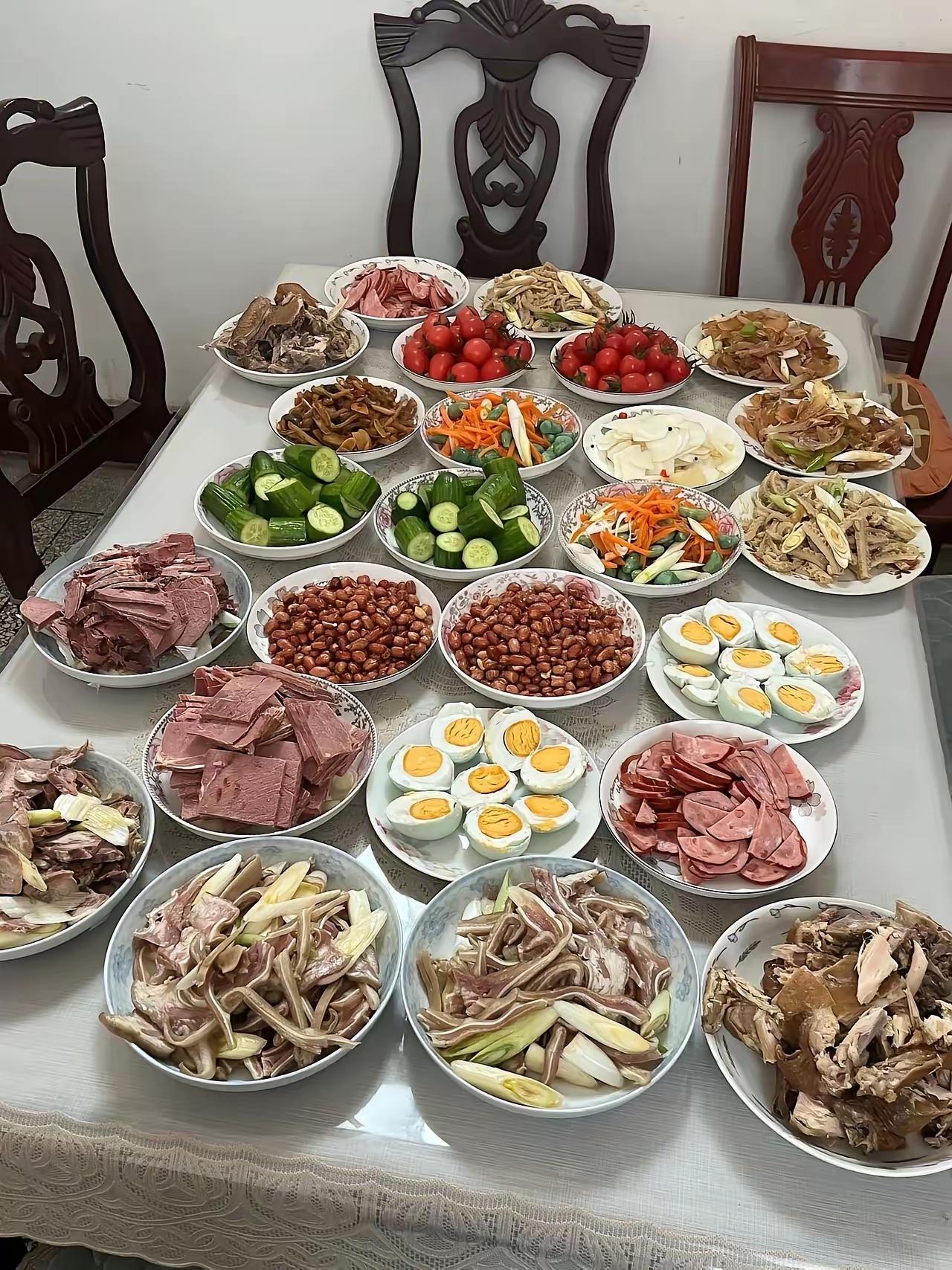一看这一大桌子菜,就知道不是湖南,湖北的,没有辣子, 也不像是广东,福建的,没有汤。大家动动脑子,知道这是啥地方的菜?