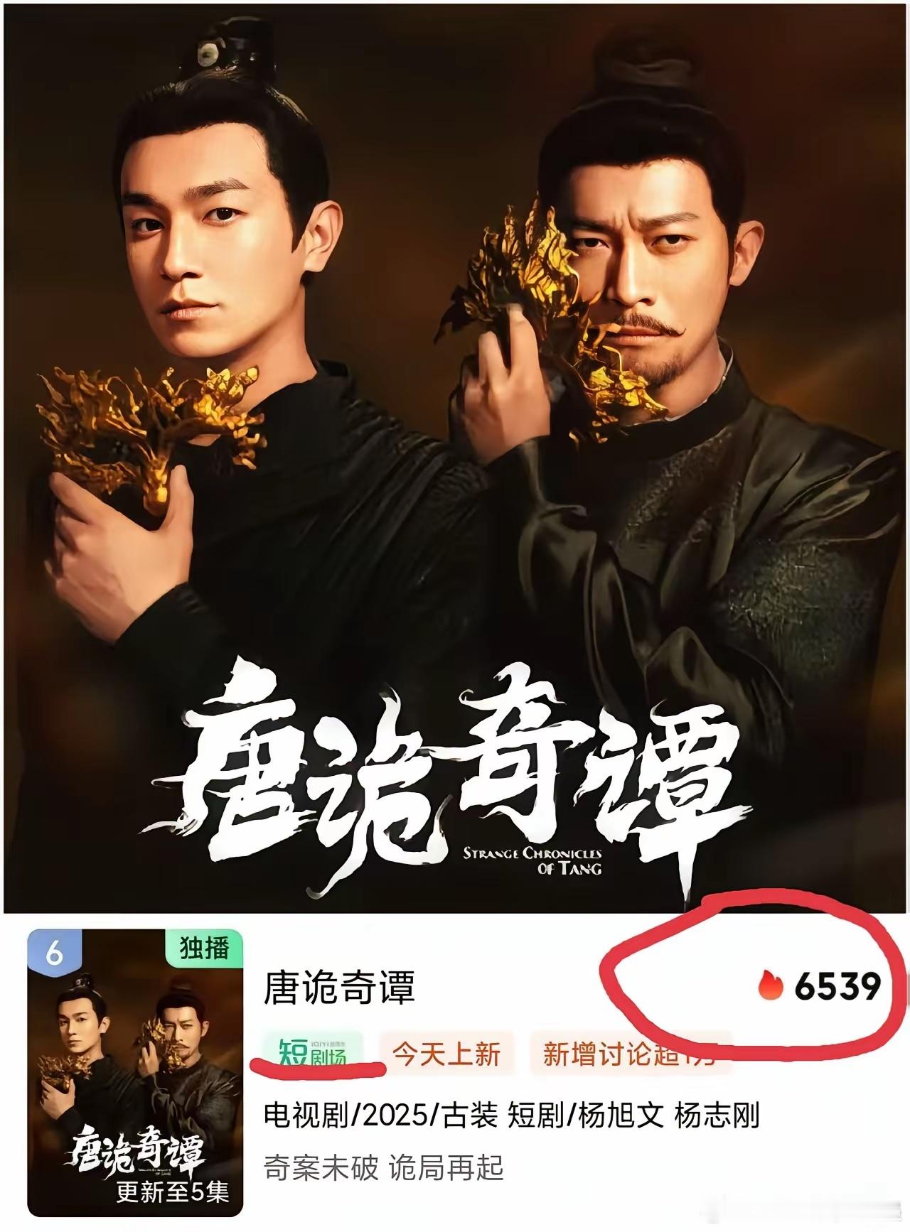 杨旭文可能没想到,郭靖宇、杨志刚恐怕也会感到意外,他们《唐诡奇谭》闯中短剧赛道竟然会刷新爱奇艺平台中短剧的热度记录,并且有可能会创下一个短时间平台没有中短剧能打破的记录。在《唐诡奇谭》开播以前,爱奇艺的横屏短剧史冠是《朱雀堂》,热度记录是6514,是爱奇艺横屏短剧领域的标杆之作。《唐诡奇谭》开播首天,4个小时就用6539的热度打破了它的记录。《唐诡奇谭》的衍生竖屏短剧《唐诡奇谭之长安县尉》也刷新了该平台的微剧记录。原本唐诡播长剧的时候就拥有庞大的粉丝基础,《唐诡奇谭》开播前平台预约量就冲破了300万;再加上唐诡的品质保障,虽然说是短剧的形式,但是却有着电影级别的服化道,短剧时长配上长剧的质感,暂时也就《唐诡奇谭》这么一个,观众很有热情。后续大概率会凭借口碑进一步刷新自己以及中短剧赛道的热度数据,你们觉得呢?