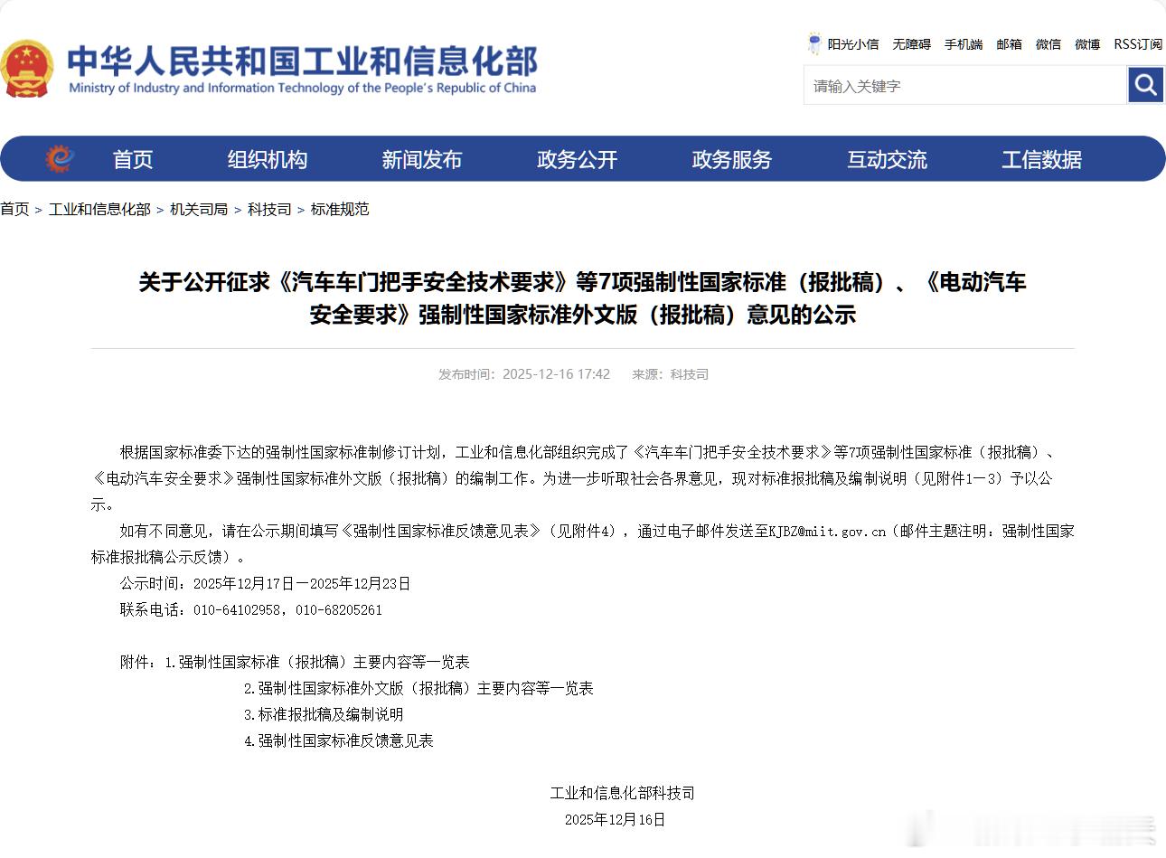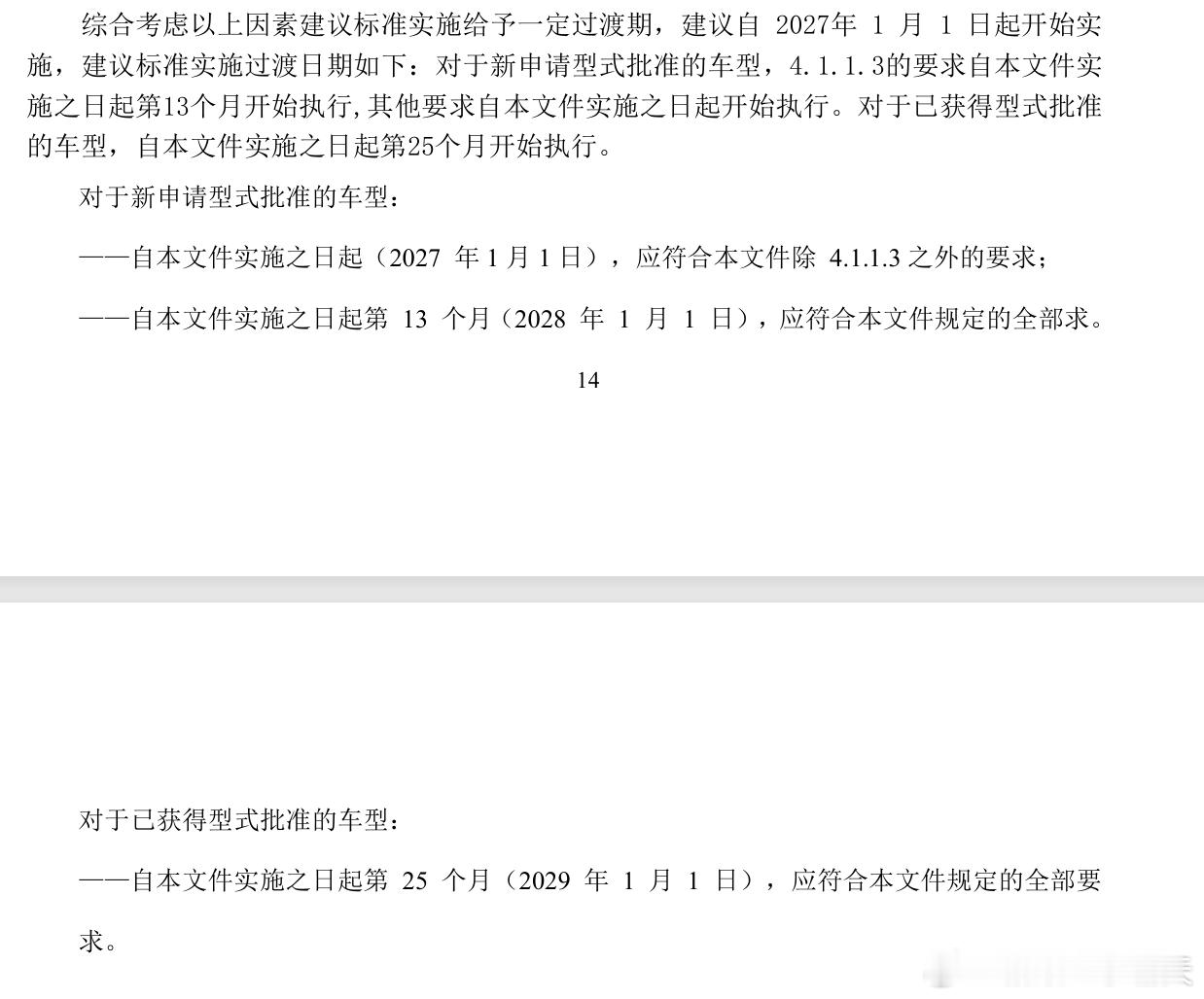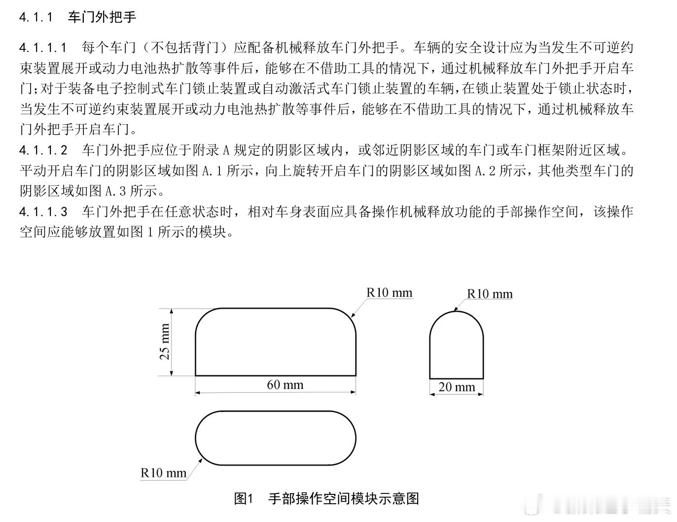 门把手式样迎来大洗牌~之前有个公开数据,销量TOP100的新能源车,60%都是隐藏式门把手。最近,图1工信部编制的《汽车车门把手安全技术要求》,算是明确要禁止全隐藏式门把手~具体要求:每个车门的车门外把手在任意状态时,相对车身表面应具备手部操作空间,该操作空间应不小于60mm×20mm×25mm(图2)。这就要求必须要能扣开门。值得注意的是,新规从2027年1月1日开始实施。新申报的车型,2028年1月1日起就得符合新规;已经获批的老车型,最晚2029年1月1日前完成整改。(图3)我理解是,新老车型都要改模具、改产线。不知道已生产、已交付的车型会不会要改门把手明确禁止全隐藏式门把手全隐藏式门把手退场倒计时新能源汽车