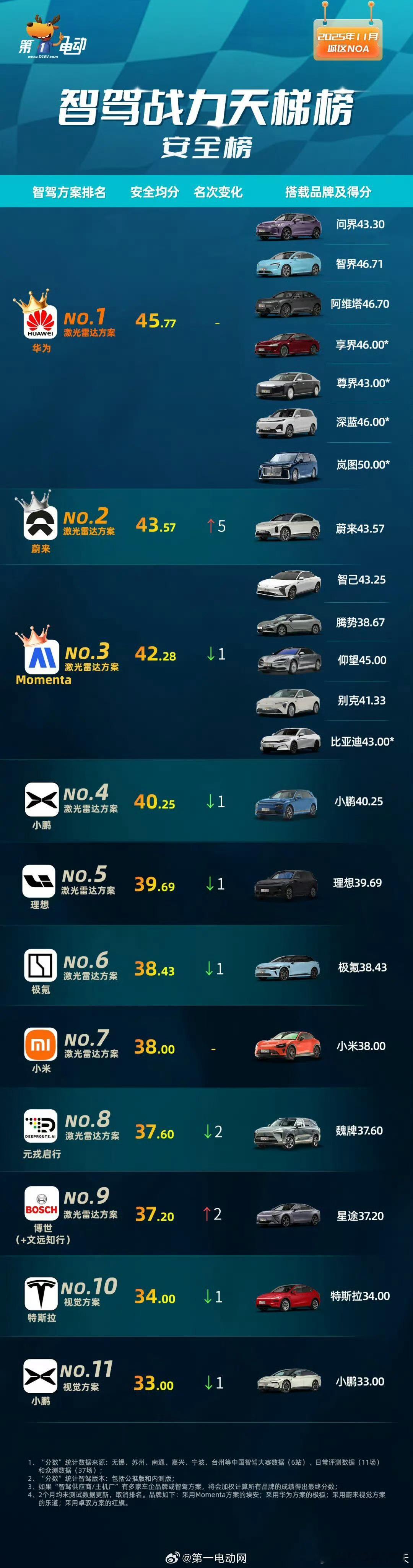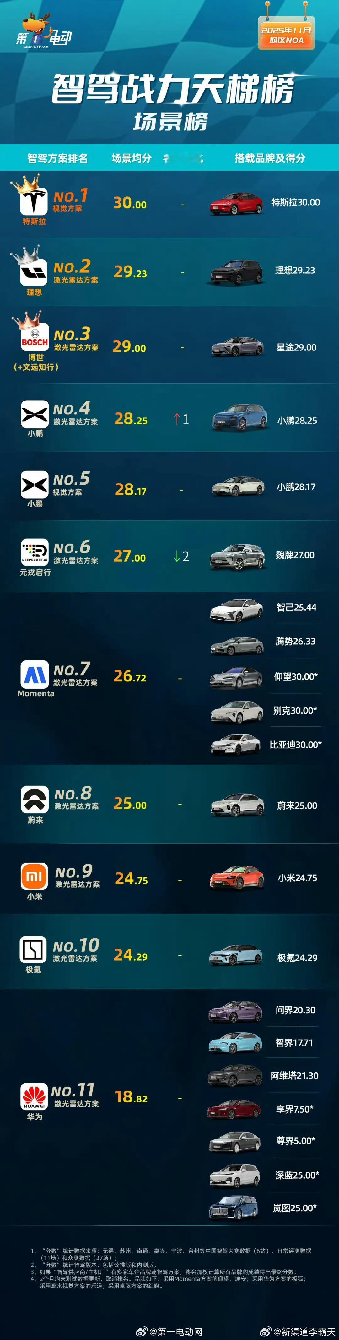 很多人在吐槽这个榜单(图3),我还是要给挽尊一下~其实他们有一系列榜单,整体不算很离谱,包括他们排的智驾第一梯队和第二梯队(图4)图3,华为在场景榜排最后,他们的解释是:“安全优先”策略在无名道路等场景下倾向于降级或退出NOA,牺牲了场景覆盖的连续性。这个特性,我之前小长测的问界 M8和享界 S9T 倒是不太有这个情况不知道各位车主怎么看?鸿蒙智行新能源汽车