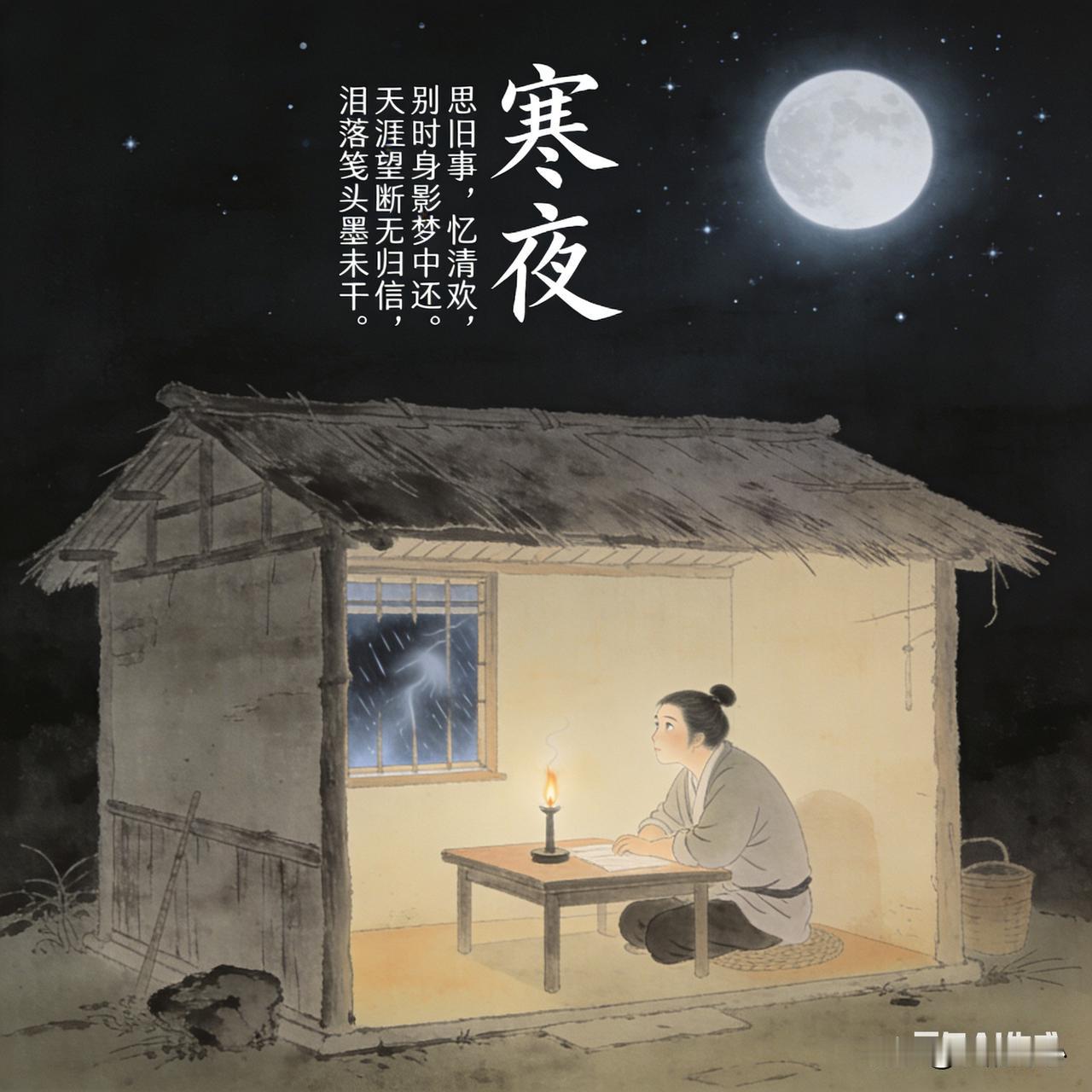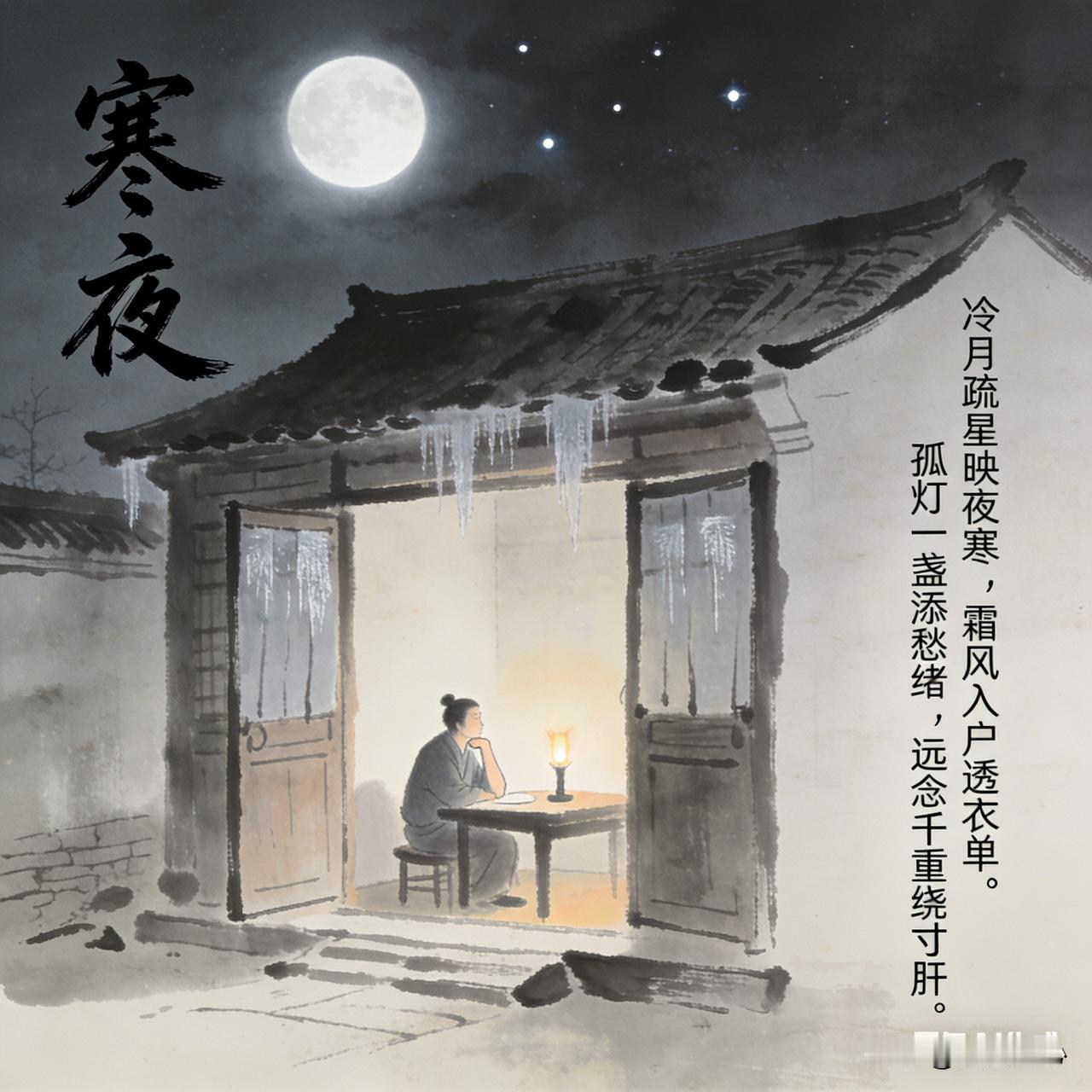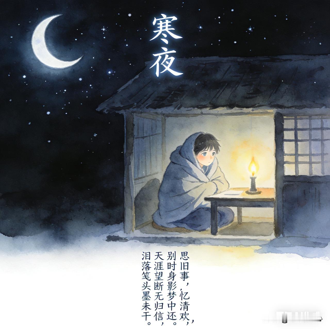 《寒夜》乐韵诗心原创诗词: 冷月疏星映夜寒, 霜风入户透衣单。 孤灯一盏添愁绪, 远念千重绕寸肝。 思旧事,忆清欢, 别时身影梦中还。 天涯望断无归信, 泪落笺头墨未干。 《寒夜》这首诗描绘了一幅孤寂凄清的寒夜相思图。冷月疏星下,霜风入户,单薄衣衫难敌夜寒。孤灯相伴,愁绪更添。诗人远念重重,回忆着往昔清欢,别时的身影常入梦中。望断天涯,却等不来归信,泪水滴落在未干的笺纸上,将思念之苦与盼归之切展现得淋漓尽致。