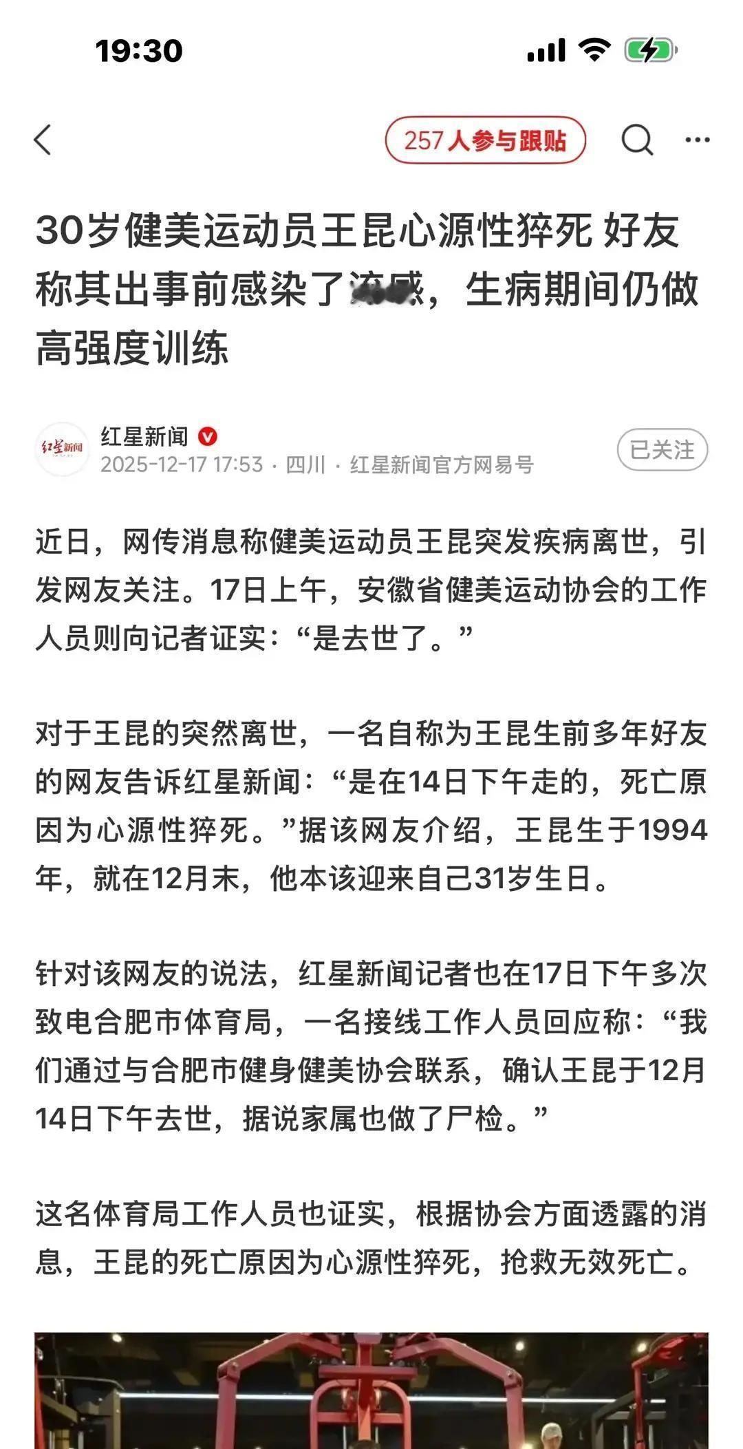 杀死他的不是懒惰,恰恰是引以为傲的自律。 30岁,顶级健美运动员王昆倒在训练后。尸检结果:心源性猝死。生前他正患流感,但选择了坚持训练。这不是个例。上个月,美国37岁职业健美运动员同样在流感后训练猝死,解剖显示急性心肌炎。 《美国心脏病学会杂志》最新研究敲响警钟:流感病毒会直接攻击心肌。当你带着病毒剧烈运动,心脏仿佛在枪林弹雨中负重奔跑。北京阜外医院专家紧急提醒:感染后至少彻底休息一周,别让心脏发炎。 可80%的业余运动者都误判了。总以为“练练出身汗就好”,坚信毅力能战胜一切身体信号。运动成瘾背后的内啡肽,让人听不见心肌哀鸣的警报。上海体院心理学团队发现,这种成瘾忽视的代价,往往是不可逆的。 行业防线也在构建。中国举重队已戴上监测手环,追踪心率变异性。国际健美联合会更新指南:感染后必须暂停训练并接受心电图筛查。但多数健身房,仍把带病坚持视为“精神氮泵”大肆宣扬。 他的肌肉能举起数百公斤,却未能扛住一次流感的偷袭。身体发出的每一次疲惫、每一声咳嗽,都是最后的求救信号。别用钢铁意志去对抗生理规律。 真正的强大不是榨干身体的每一分潜力,而是懂得在风暴来临前,为生命留一道呼吸的缝隙。