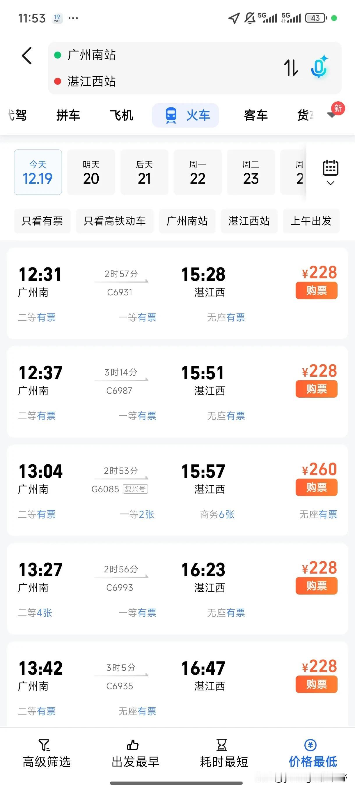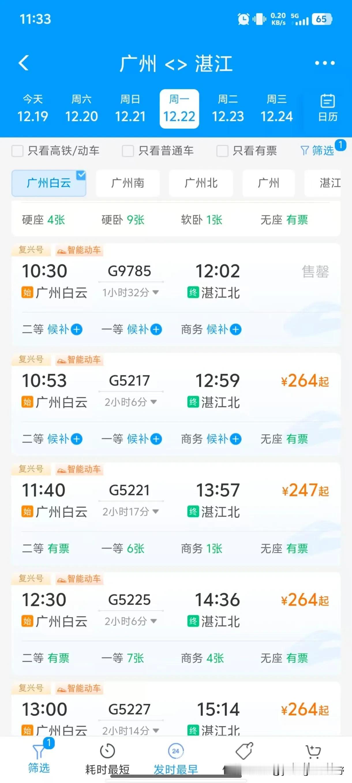 现在已经可以查询到广湛高铁的票价了,从广州白云站至湛江北站的价格是264元,比起原来江湛铁路的价格贵了三十多元,果然是水鱼号plus版。不过从时间来看,也没快特别多,性价比平时没什么,到了节假日还是很火热的。