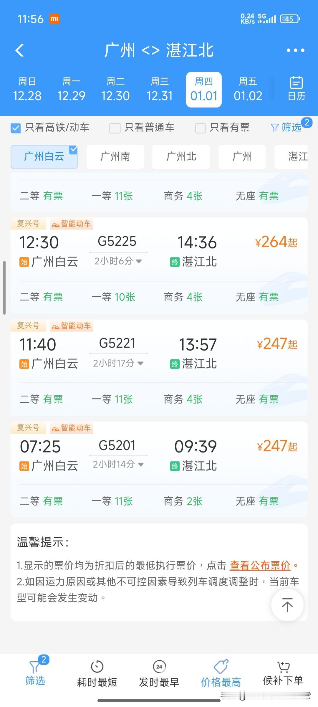 广湛高铁来了,最快1.5小时,慢的2小时 竟成“水鱼专列”?325元原价折后280,多数车次慢到离谱! 盼了好久的广湛高铁终于上线,结果一看票价和时长,直接让人懵了!原价325元的二等座,打完8.6折还要280元,本以为能感受“贴地飞行”,现实却狠狠打脸。 翻了元旦车次表,只有G5241这趟车是真·直达,16点从广州白云出发,1小时32分飙到湛江北。可其他车次比如G5201,要挨个停新兴南、阳江北等站,硬生生把行程拉到2小时14分,这速度跟普通动车没啥两样。 花着高铁的钱,体验着“站站乐”的慢节奏,难怪湛江网友直呼自己成了“水鱼”。这票价配这体验,实在让人想不通。 难道在规划者眼里,湛江人都是不差钱的土豪,愿意为这“伪高铁”买单?