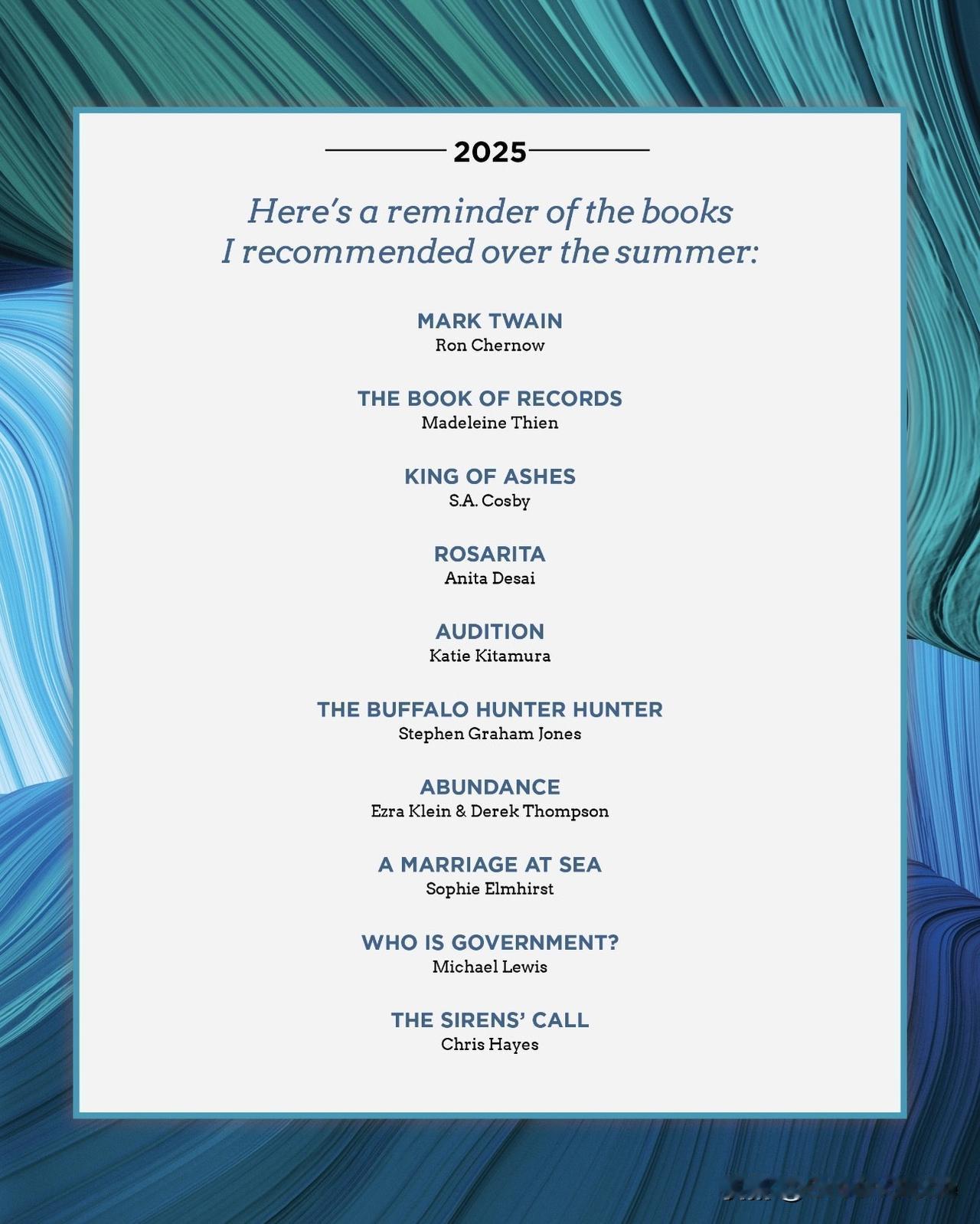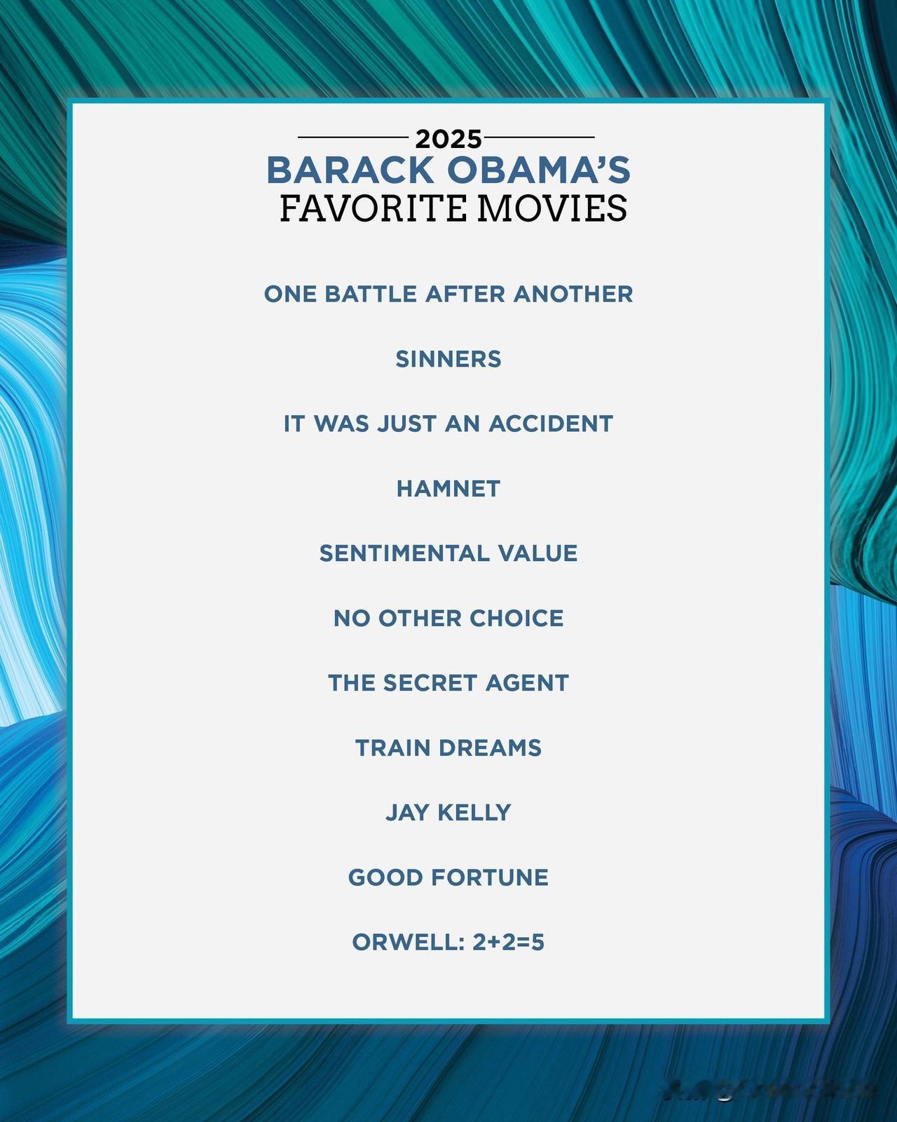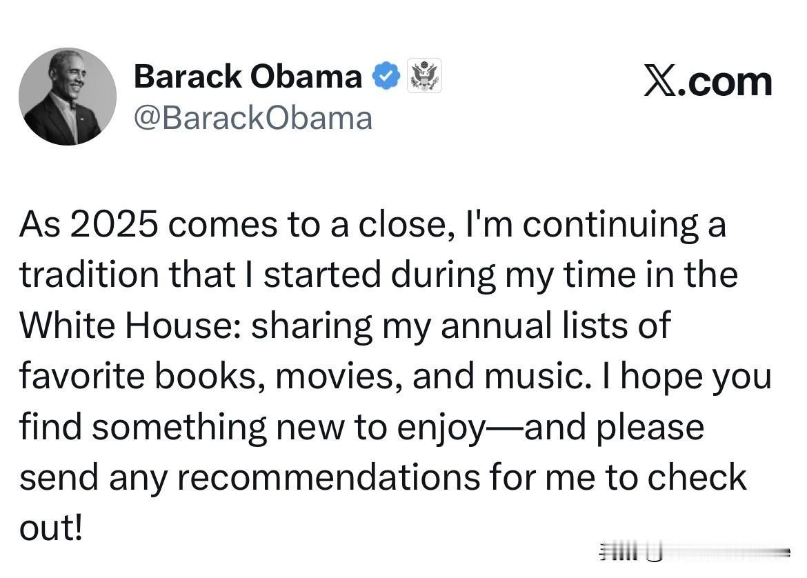 美国前总统奥巴马在最新的贴文中写道:2025年即将结束,我将继续我在白宫时期就开始的传统:分享我每年最喜欢的书籍、电影和音乐清单。希望你们能从中找到一些新的乐趣——也欢迎大家推荐给我,让我有机会去看看!