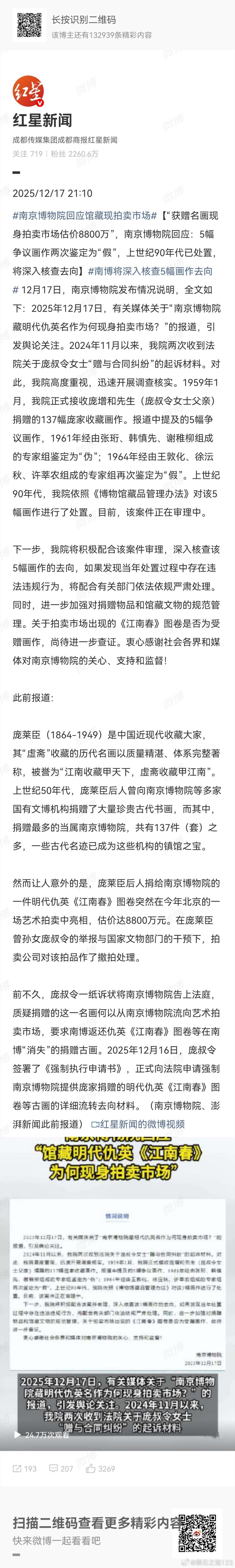 南京博物院回应馆藏现拍卖市场就问一句话,既然南京博物院两次鉴定捐赠画作为“伪作”