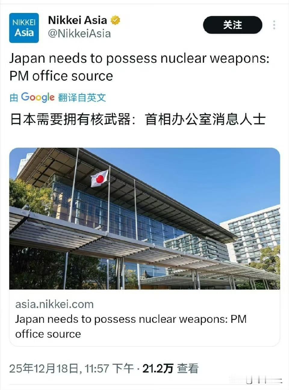 日本公开宣布要拥核,一个战败国这么嚣张,完全可以进行军事打击了。 伊拉克、伊朗、朝鲜当年说这话的时候,美国马上经济制裁加封锁,完全不给任何机会。 日本一个二战战败国,公开挑衅联合国宣言和二战后一系列国际法,我们完全可以进行军事打击 就算不直接教训,也可以在联合国提起制裁议案,通不通过另说,但一定要抢占道义制高点!