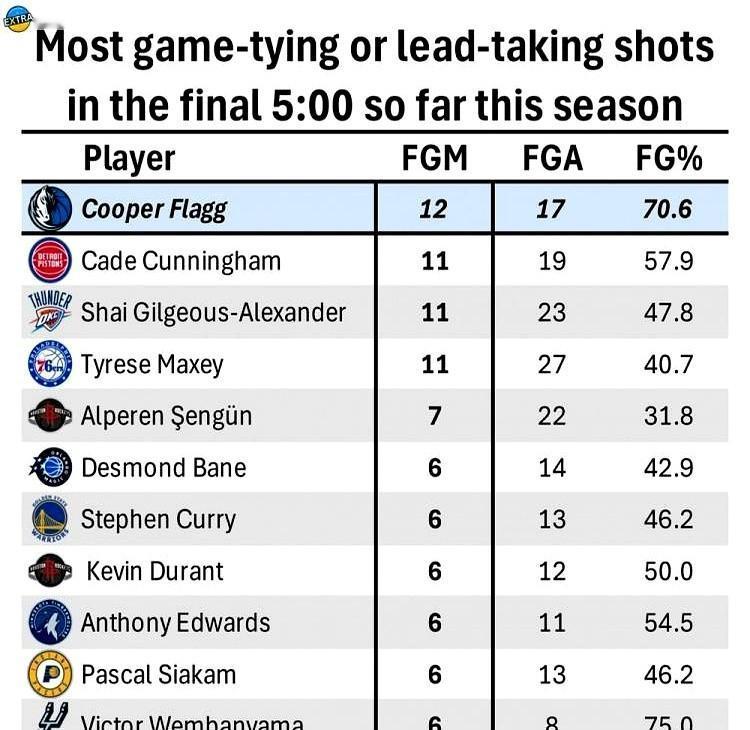24-25赛季关键球榜,新秀弗拉格登顶! 库珀·弗拉格作为2025年独行侠状元秀,24-25赛季最后5分钟扳平/反超球拿了12个,命中率70.6%直接霸榜第一。这数据放新秀身上真太能打太能打了!他的攻框和投篮稳定性,难怪独行侠敢依赖他。 申京在榜单里有点尴尬,22次出手仅次于马克西和亚历山大,但命中率31.8%,是唯一以3开头的球员。效率确实有点低有点低,没跟上出手次数。 纽约尼克斯的布伦森拿了24-25赛季Kia Clutch Player of the Year,场均关键得分5.6分联盟最高,52个命中领跑全联盟,实至名归。 文班亚马这赛季关键球命中率75%,也是真稳。这些数据,就是球员关键能力的最好证明。