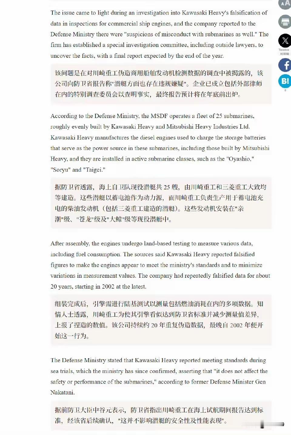 论造假这块,日本人已经遥遥领先我们了。 我都已经忘了这些年日本大型企业爆出了多少数据造假的丑闻了。 这次是川崎重工,轮到了潜艇数据造假。而且持续20年造假。 下一个不知道是哪家日本企业,或许每一家都有吧。