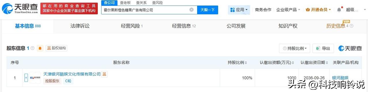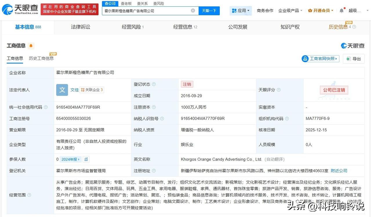 【银河酷娱一公司注销 银河酷娱旗下广告公司注销】 天眼查工商信息显示,近日,霍尔果斯橙色糖果广告有限公司登记状态从存续变更为注销。此前,该公司已发布简易注销公告。 霍尔果斯橙色糖果广告有限公司成立于2016年9月,法定代表人为文佳,注册资本1000万人民币,经营范围包括从事广告业务、展览展示服务、经营演出及经纪业务等。股东信息显示,该公司由天津银河酷娱文化传媒有限公司全资持股。据报道,此前,赵露思曾发长文公开控诉银河酷娱,引发多方关注。 天眼查信息: