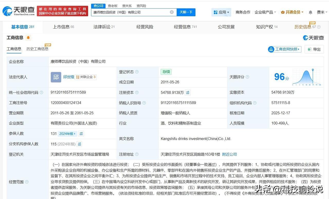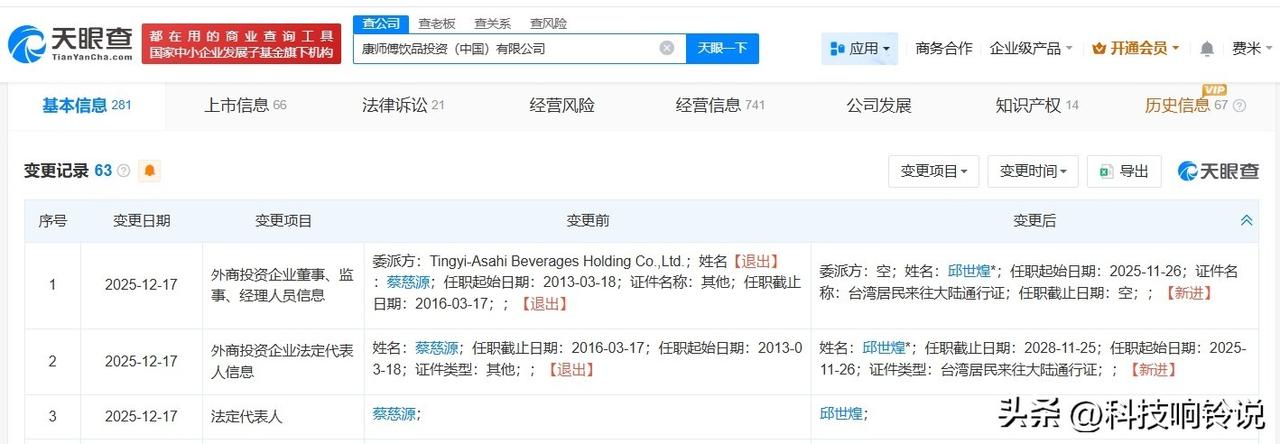 【康师傅饮品投资公司董事长变更】 天眼查App显示,近日,康师傅饮品投资(中国)有限公司发生工商变更,蔡慈源卸任法定代表人、董事长,由邱世煌接任。 该公司成立于2011年5月,注册资本约5.5亿人民币,经营范围包括在国家允许外商投资的领域依法进行投资,为其母公司、关联公司、所投资企业提供品牌推广、市场营销服务等,由KSF Beverage Holding Co.,Ltd.全资持股。 天眼查信息: