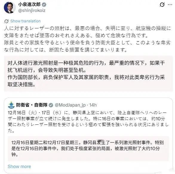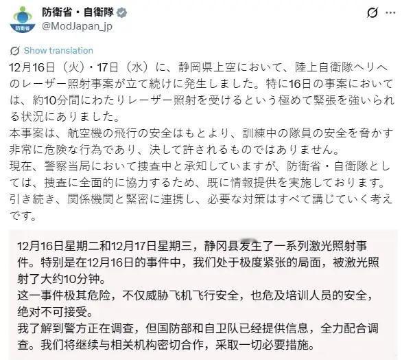 根据你提供的报道,日本静冈县空域的自卫队直升机在16日和17日连续两天遭到激光照射事件,尤其是16日的事件持续时间较长,达10分钟。这一情况引发了日本防卫省的高度关注和紧急应对。 目前,日本防卫省已对事件进行了通报,并采取了相应的措施,包括报警和调查。激光照射可能对飞行安全造成威胁,也反映出区域安全局势的紧张。 关于中国是否涉事的猜测,网络上存在一些臆测,但尚无官方或确凿的证据表明事件与中国有关。激光照射事件在国际上并不少见,可能由多种因素引发,包括误操作、恶意行为或其他国家的试探。 日本方面已表达关切,强调将加强监控和防范措施,以确保飞行安全。同时,也呼吁有关国家遵守国际规范,避免类似事件再次发生。 如果你需要更详细的分析或最新的官方动态,可以关注日本防卫省的官方公告或国际安全相关的权威报道。