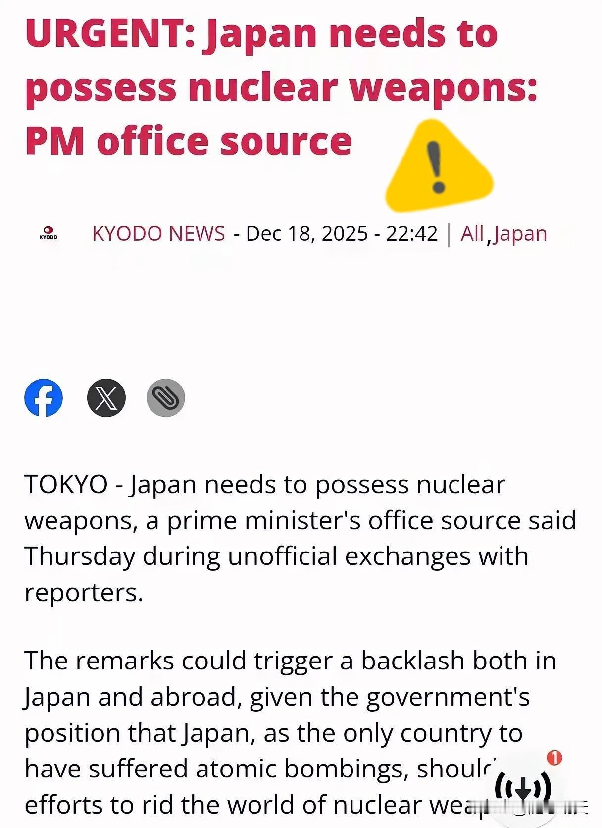 日本终于暴露拥核野心!!! 12月18日,日本首相高市早苗官邸安保高官公然称“日本应拥有核武器”,这番言论绝非随口之言,而是日方对核政策的舆论试探。 该官员系首相安全政策核心顾问,其发言借质疑美国“核保护伞”、拿周边国家核力量当借口,而高市早苗对“无核三原则”的表态也愈发模糊,回避是否修订这一核心国策。 更值得警惕的是,日本已囤积47吨钚材料,按8公斤钚造一枚核弹计算,足以打造近6000枚核弹头,远超民用核能需求,核武研发的物质基础早已具备。 此番言论引发日本国内强烈反对,公明党、日本共产党痛批其无视核爆历史;国际社会也高度警惕,朝方斥其为军事化危险信号,中方多次警告日本勿重走军国主义老路。 看似“个人观点”的表态,实则是日本突破核束缚的试探,其拥核野心已藏不住,一旦成真,东亚和平格局将面临严峻挑战。 日本高官表态是真的想拥核,还是只是试探国际反应?倘若日本真突破核限制,东亚局势会走向何方?