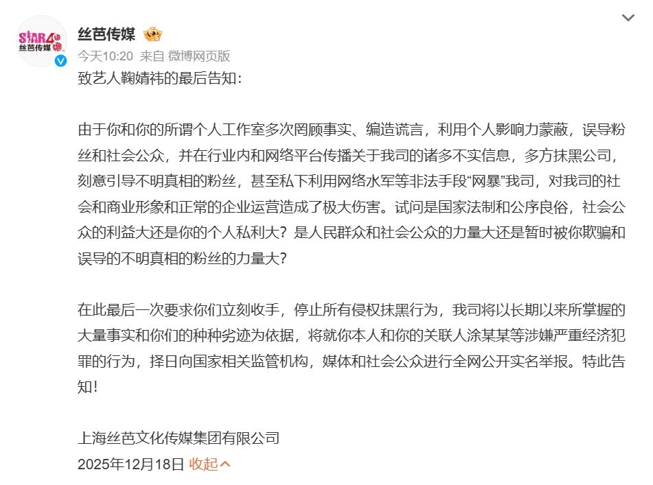 这合约大战也太刺激了!丝芭传媒直接放话鞠婧祎再不停手就要实名举报她“严重经济犯罪”,还曝出她7年狂赚1.4亿!这姐也硬气回怼说公司伪造签名做阴阳合同……你觉得谁在说谎? #鞠婧祎#